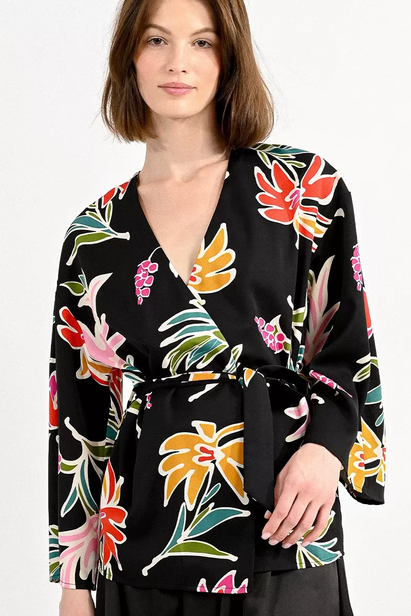 Kimono in tessuto tecnico fluido. Scollo incrocio, chiusura con cintura in tinta. Maniche lunghe con fondo ampio. Corto in vita. Vestibilità regolare. Taglia in foto S. Composizione tessuto 100% poliestere.