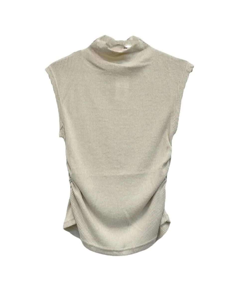 Maglia smanicata modello gilet in tessuto lavorato a canaletti. Collo lupetto morbido, lati drappeggiati. Vestibilità regolare.