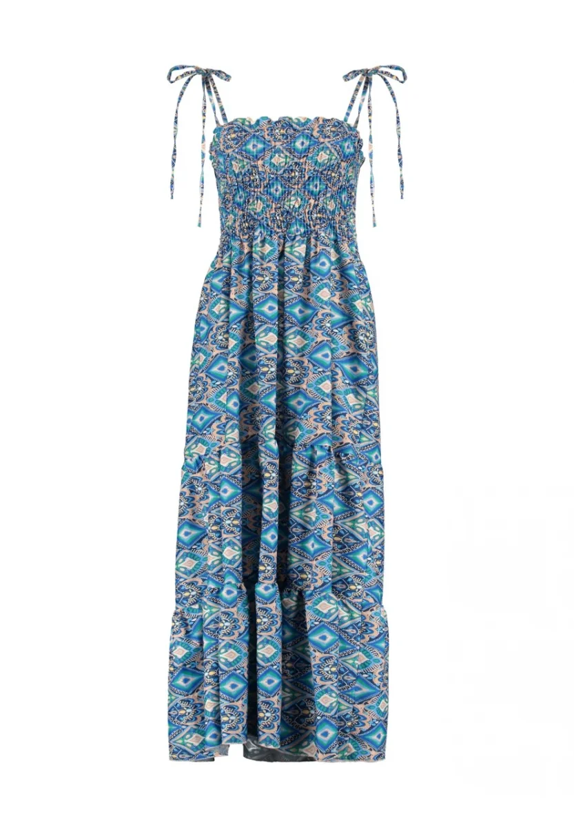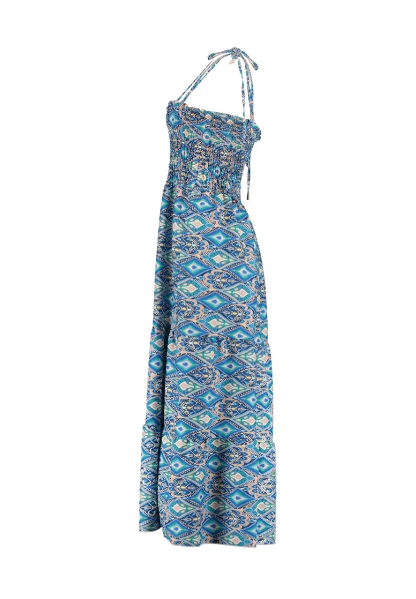 Vestito lungo in tessuto leggero liscio. Doppia bretella sottile regolabile con fiocco, corpetto elastico smock. Taglio in vita, gonna lunga con balze sul fondo. Vestibilità regolare. Composizione tessuto 100% poliestere.