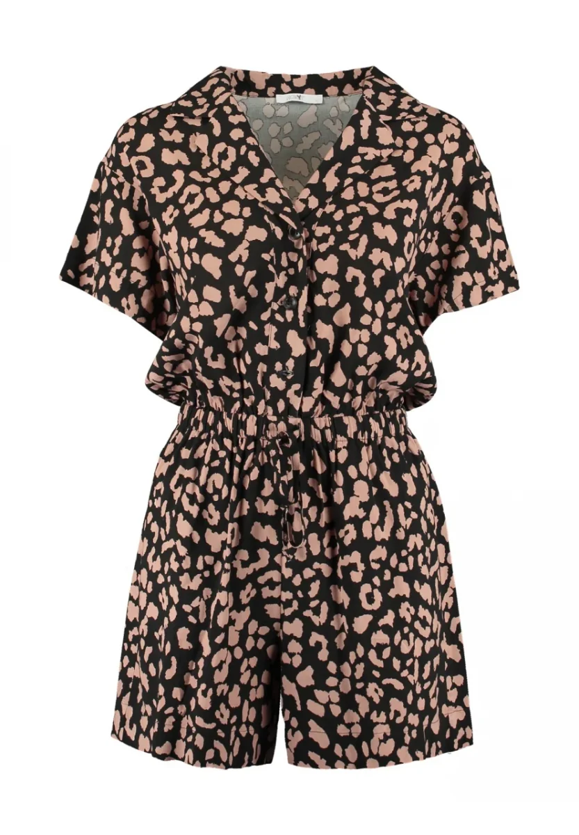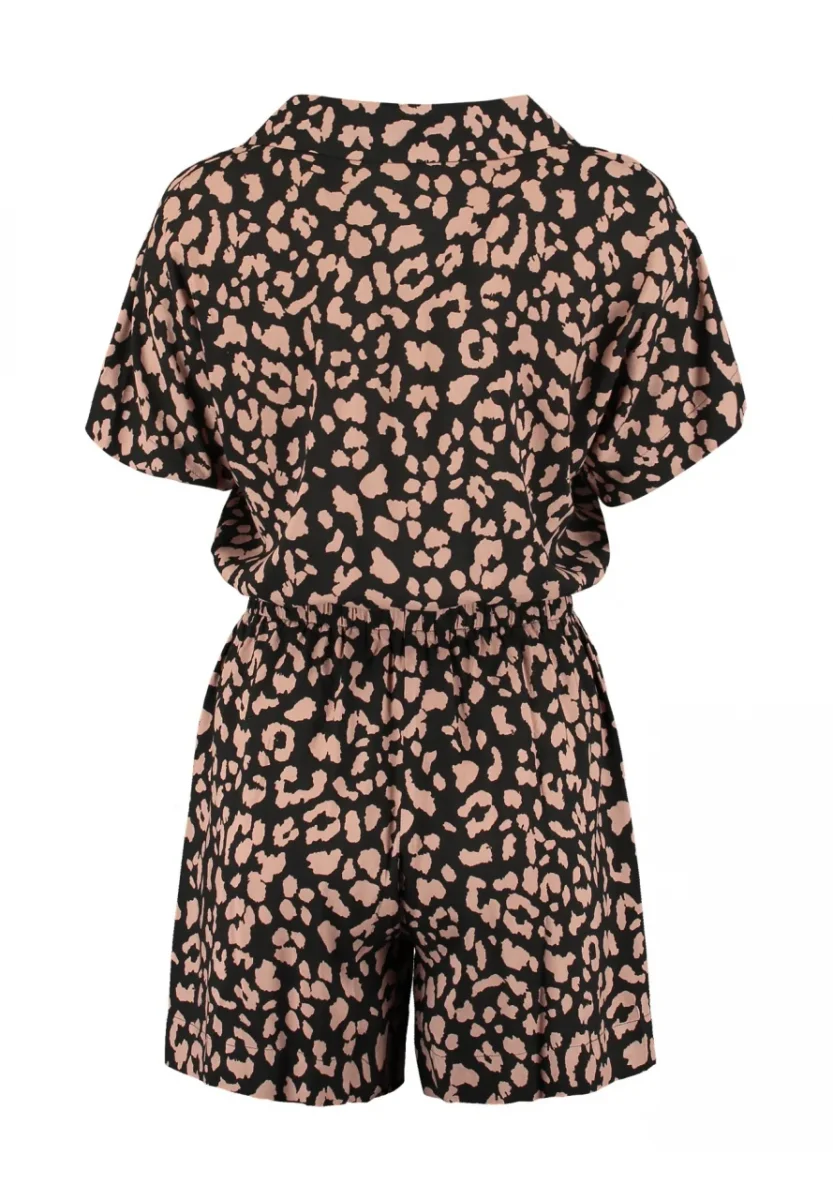 Tutina corta in tessuto leggero 100% viscosa. Fantasia maculato stilizzati. Maniche corte, scollo a punta. Abbottonatura centrale con bottoncini. Elastico in vita con coulisse, pantaloncino corto a metà gamba. Vestibilità regolare.