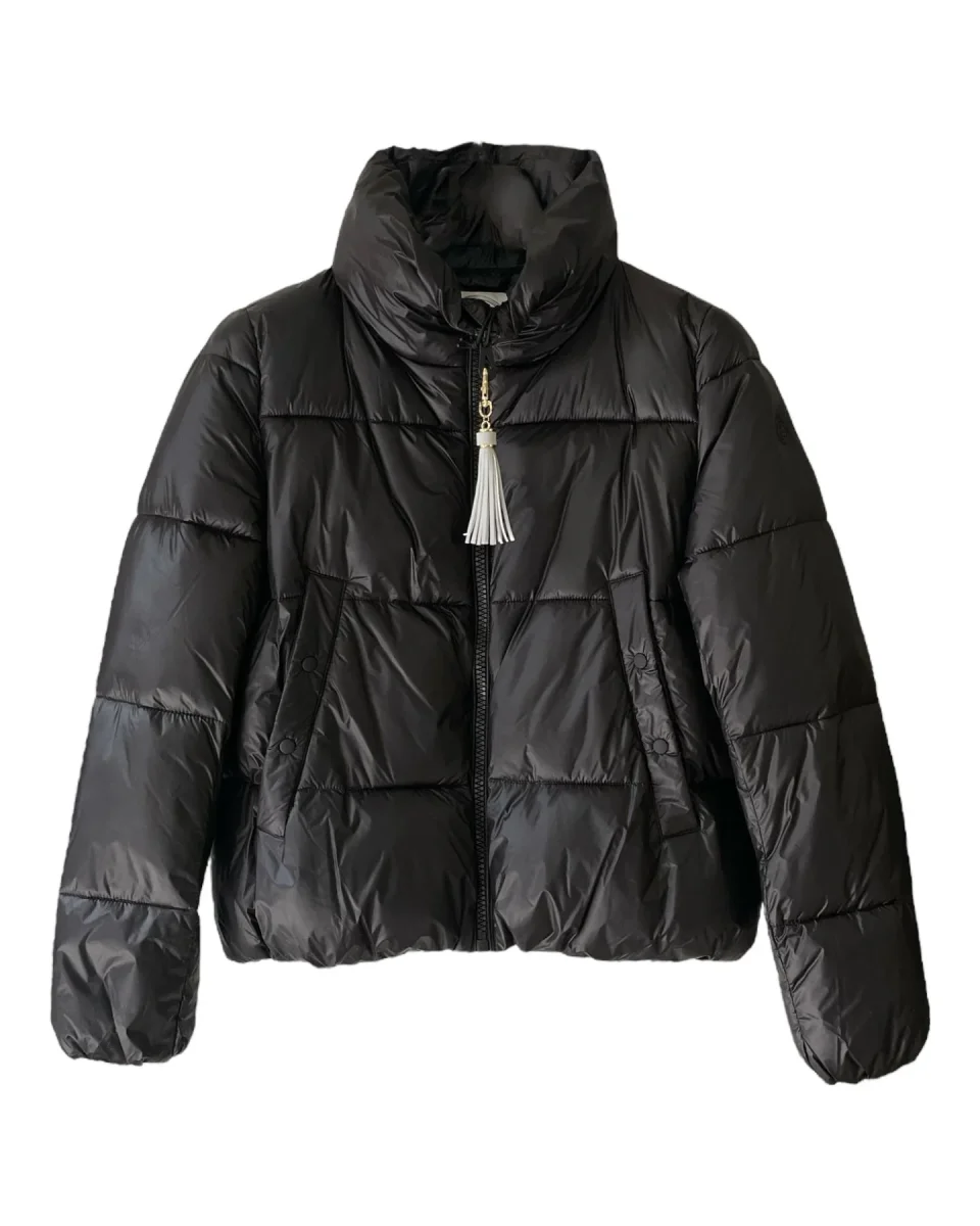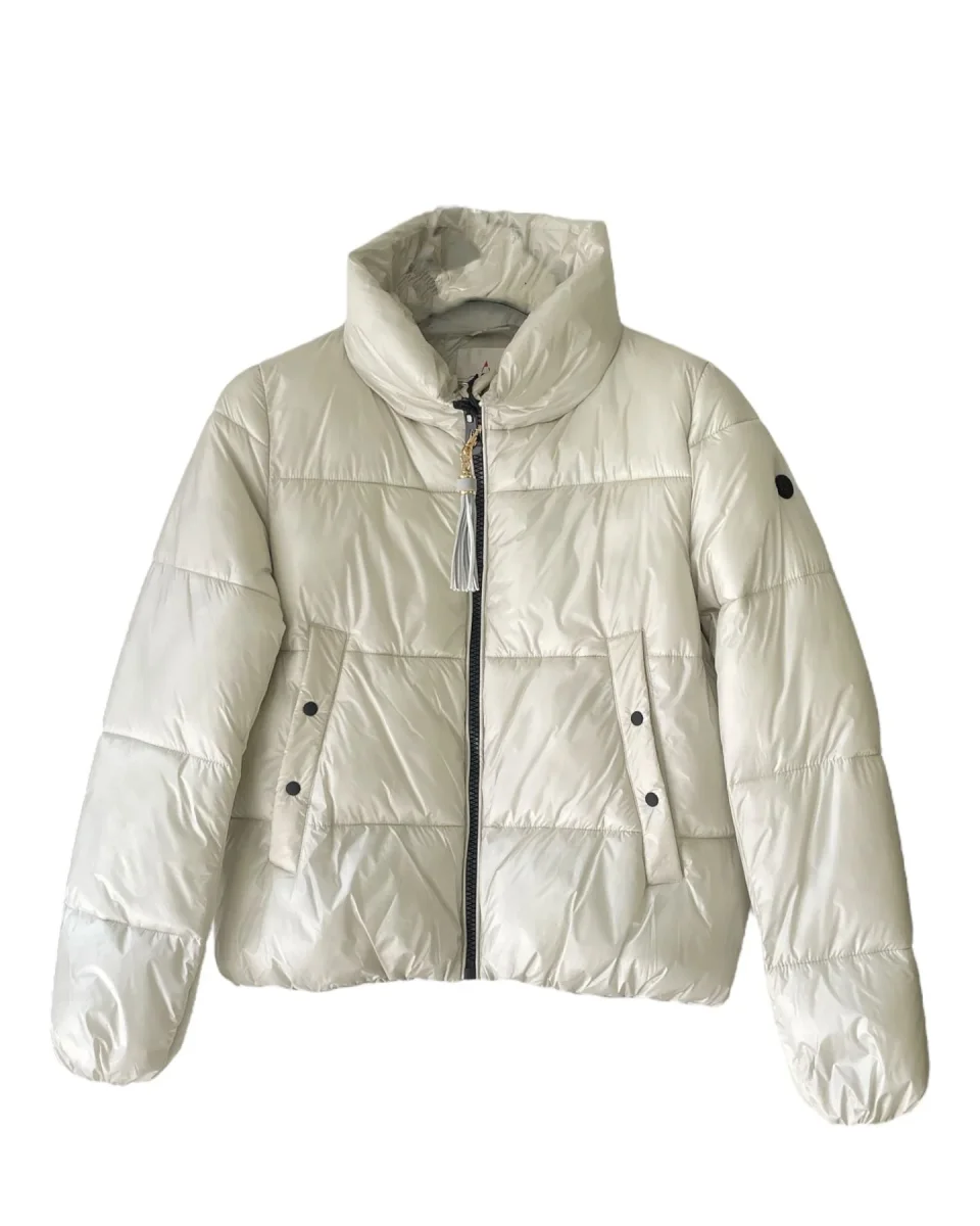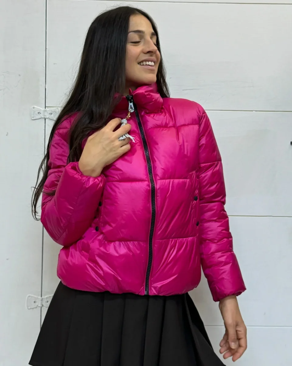 Piumino corto modello bomber in tessuto tecnico effetto cangiante. Collo a pistagna, chiusura con zip a vista, dettaglio nappina rimovibile. Polsino con elastico. Tasche laterali chiuse da bottoni automatici. Fondo con elastico effetto bomber.