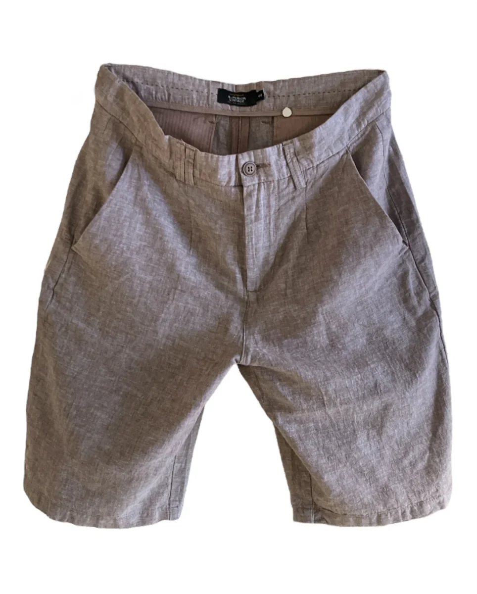 Bermuda in tessuto leggero misto lino e cotone. Chiusura con zip e bottone, tasche a filo laterali, taschine posteriori chiuse con bottone. Lunghezza a metà gamba. Vestibilità regolare. Composizione tessuto 55% lino 45% cotone.