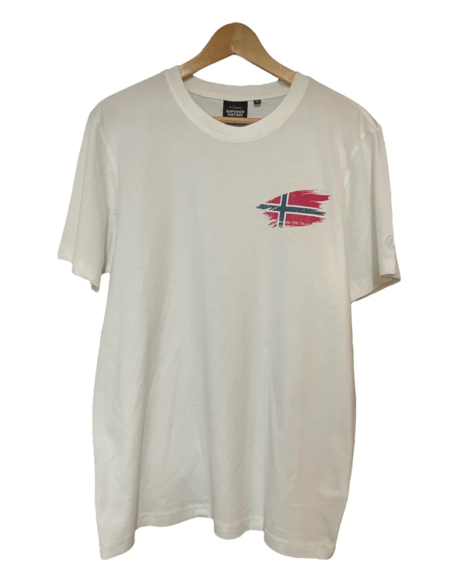 T-shirt con stampa tessuto 100% cotone. Girocollo classico, maniche corte. Stampa sul petto bandiera stilizzata.