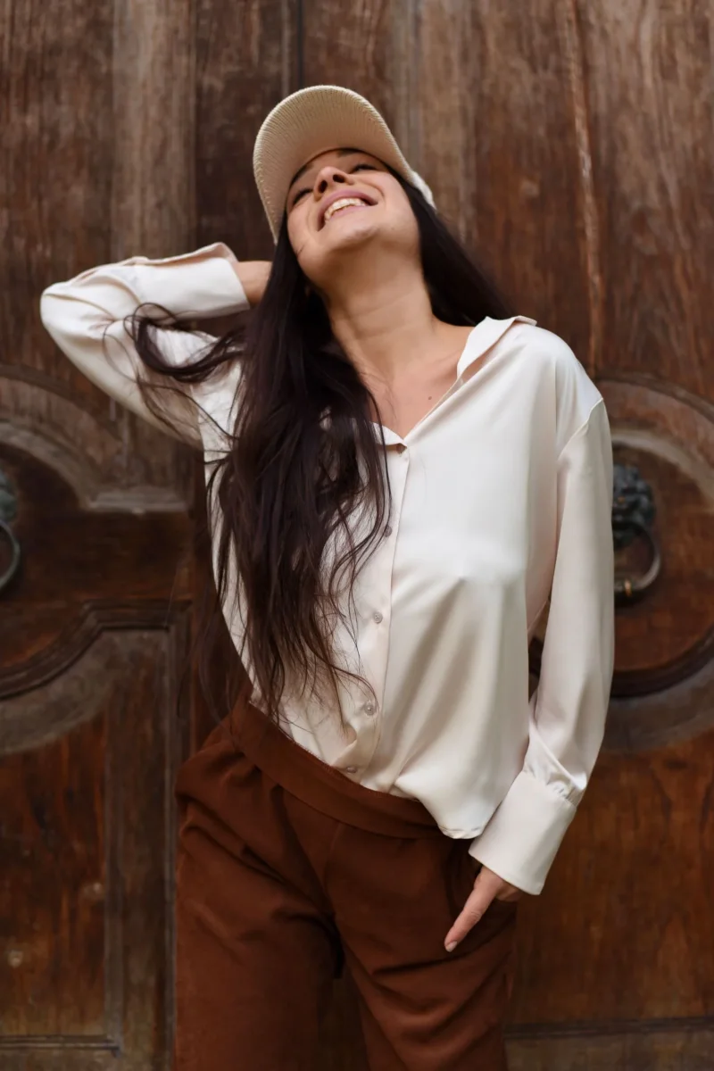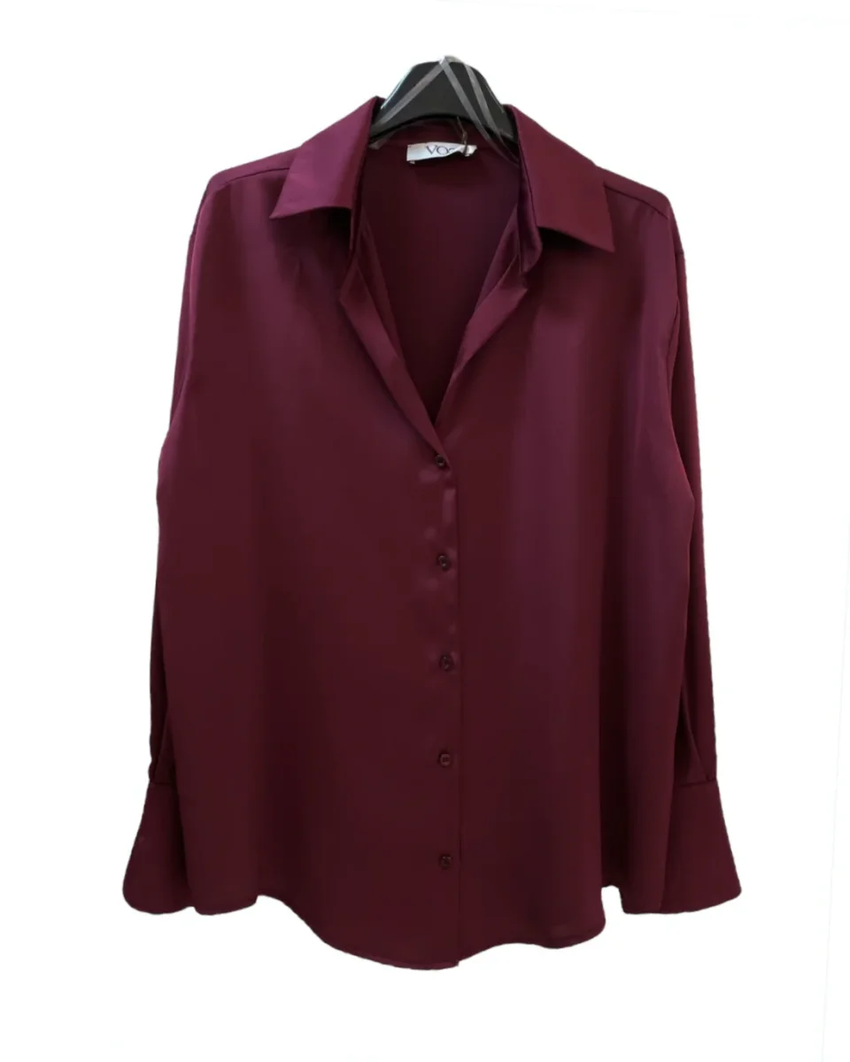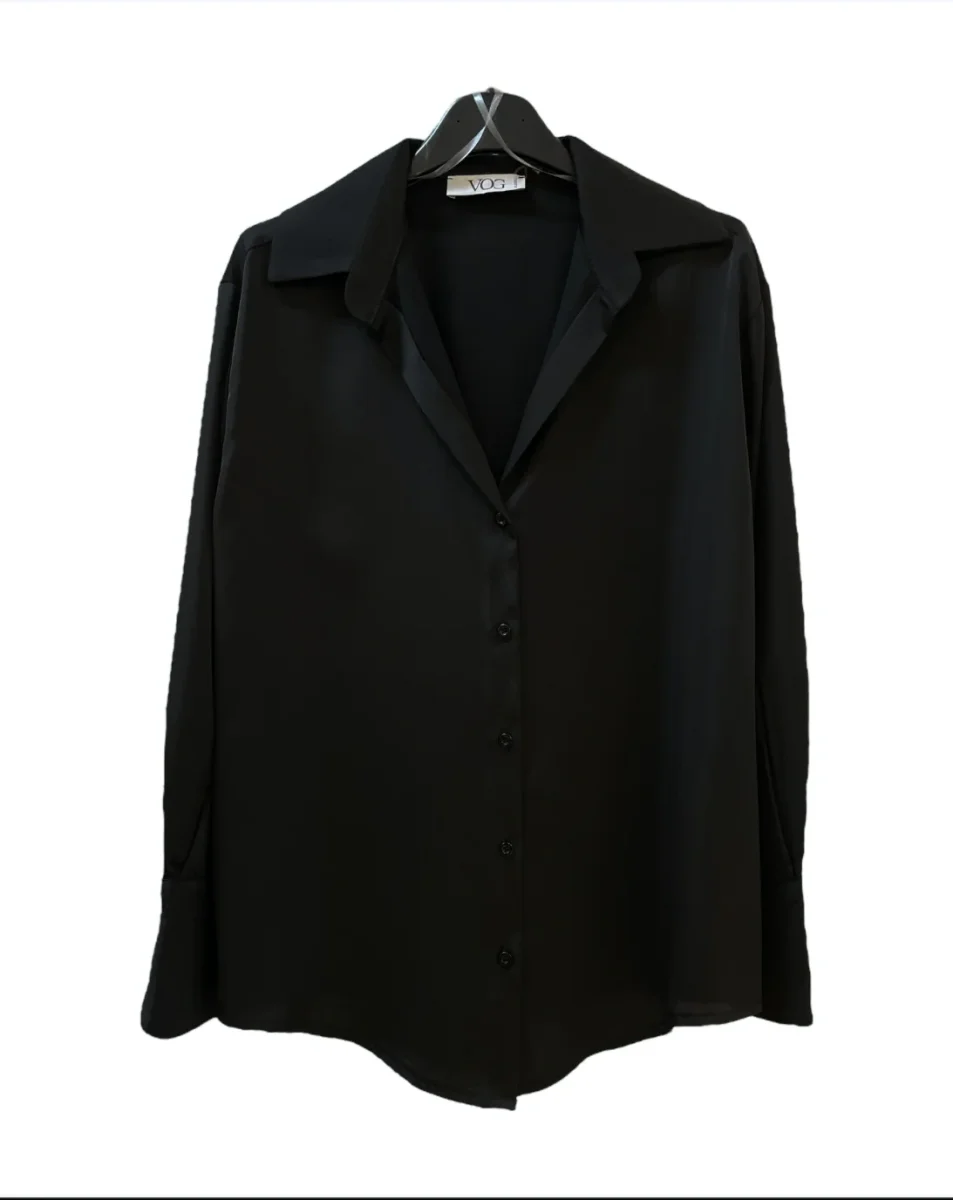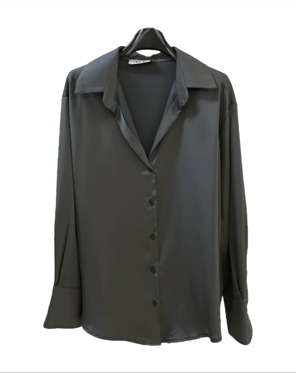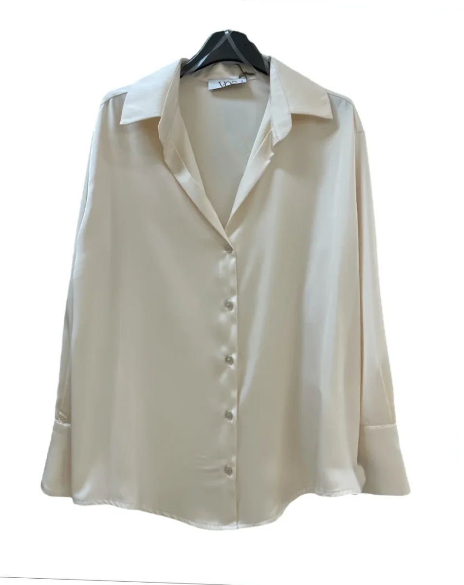 Camicia in tessuto raso lucido. Colletto piccolo, scollo a punta e chiusura con bottoni in tinta. Vestibilità dritta. Maniche lunghe, polsini stondati chiusi da bottoni.