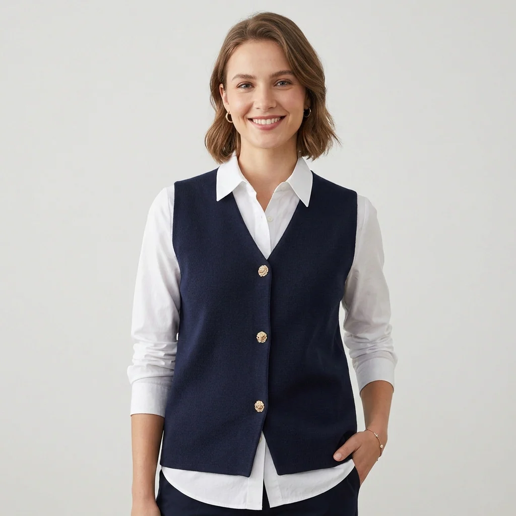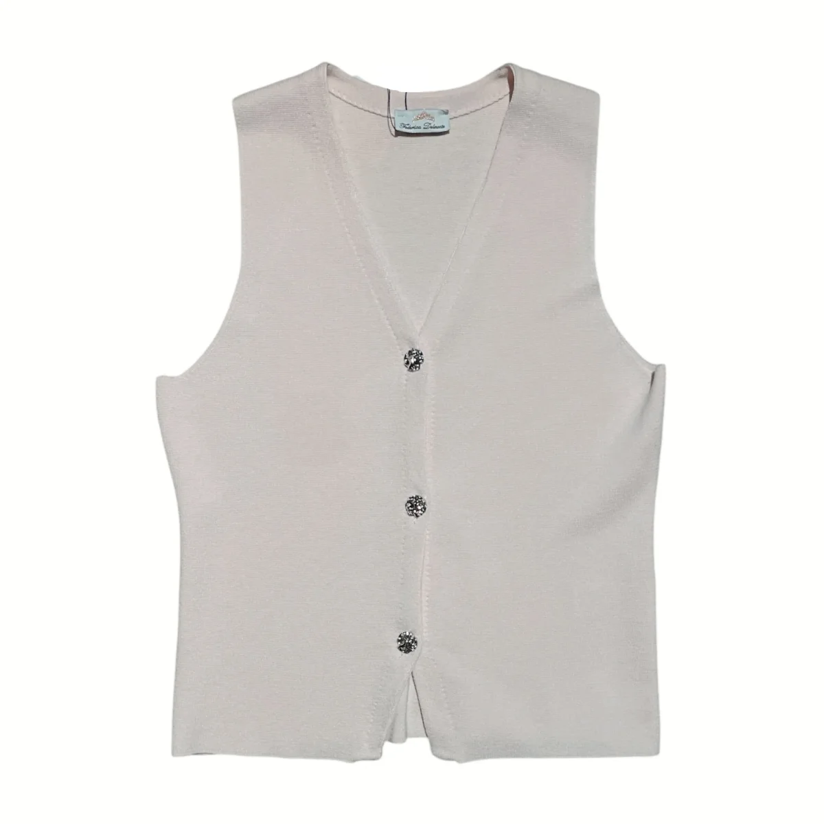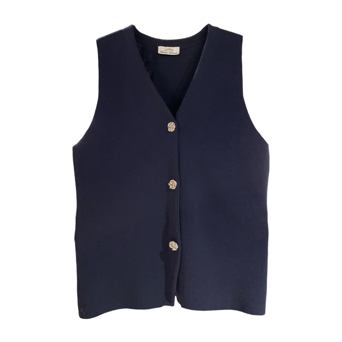 Gilet donna in tessuto elasticizzato lavorato. Scollo a punta, bordo con impunture su tutta la lunghezza. Chiusura con bottoni lavorati color oro. Vestibilità dritta, veste dalla XS alla M. Composizione tessuto 70% viscosa 30% poliestere.
