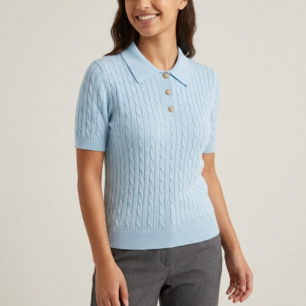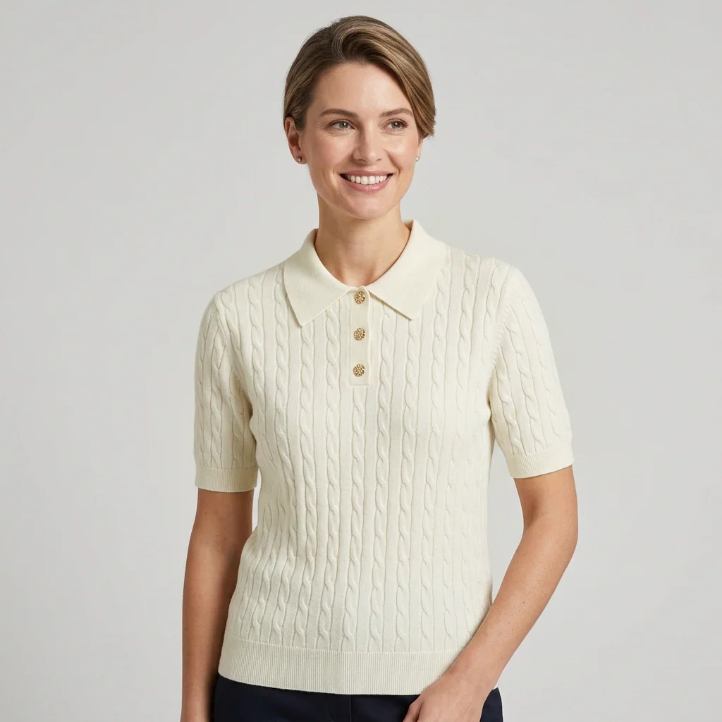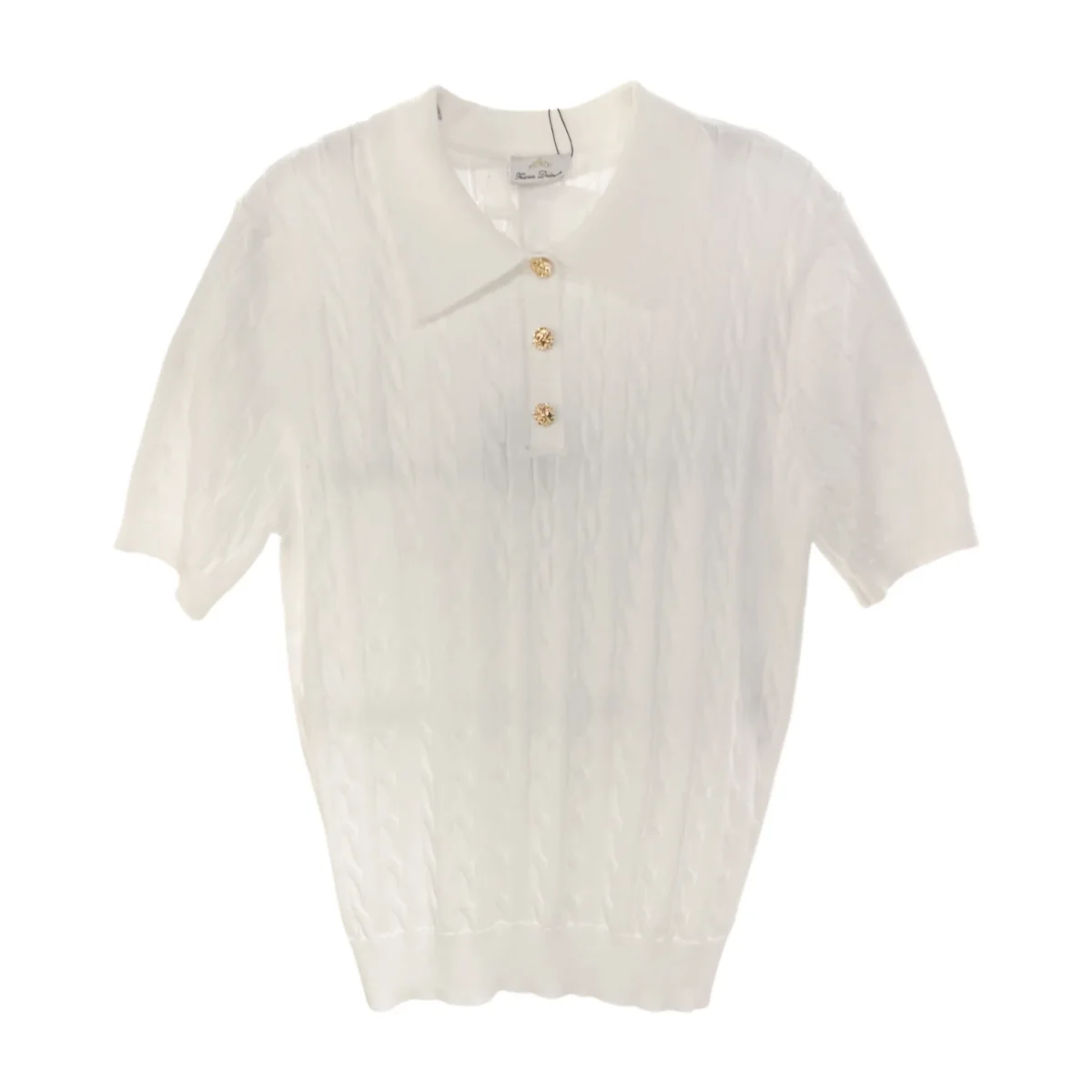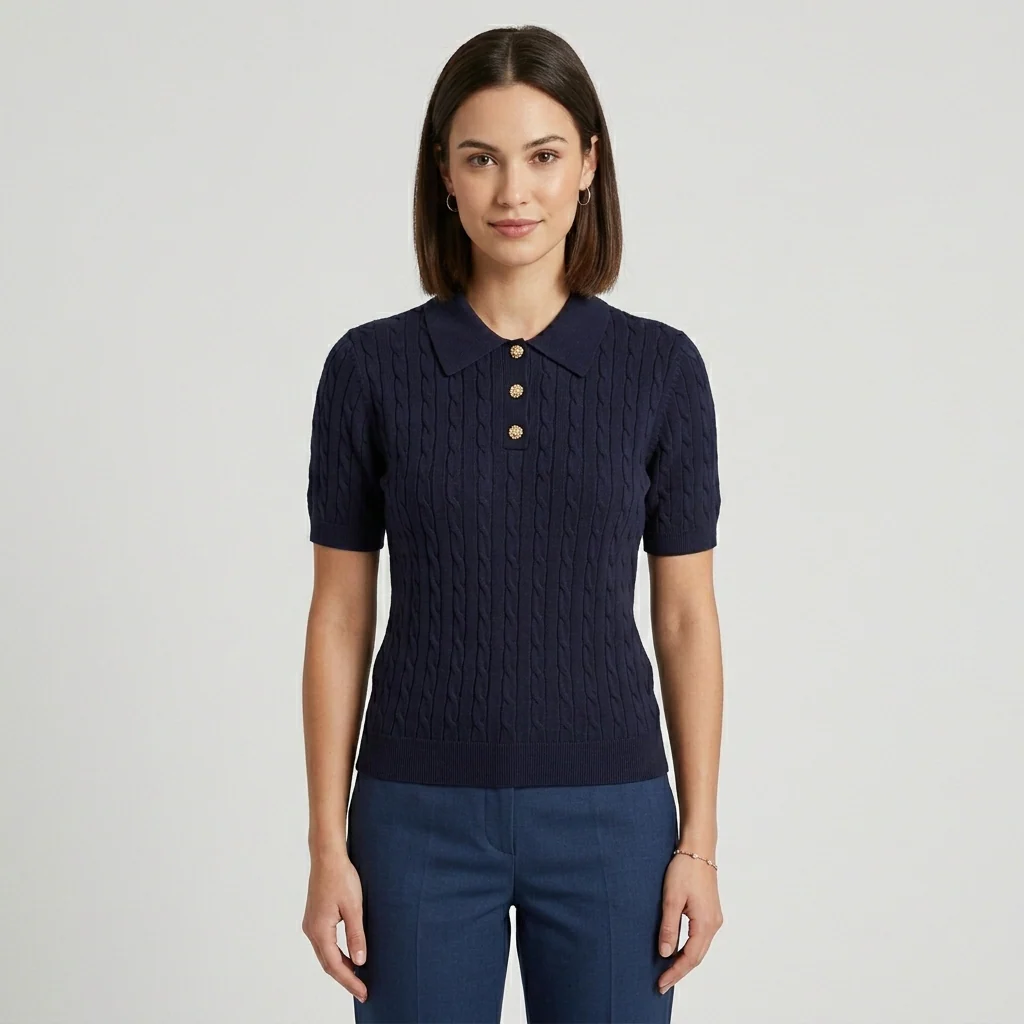 Polo donna maniche corte in tessuto misto viscosa. Colletto piccolo, bottoni gioiello. Maniche corte, motivo a trecce su tutta la lunghezza. Bordi e fondo rifiniti a costine. Composizione tessuto 70% viscosa 30% poliestere.