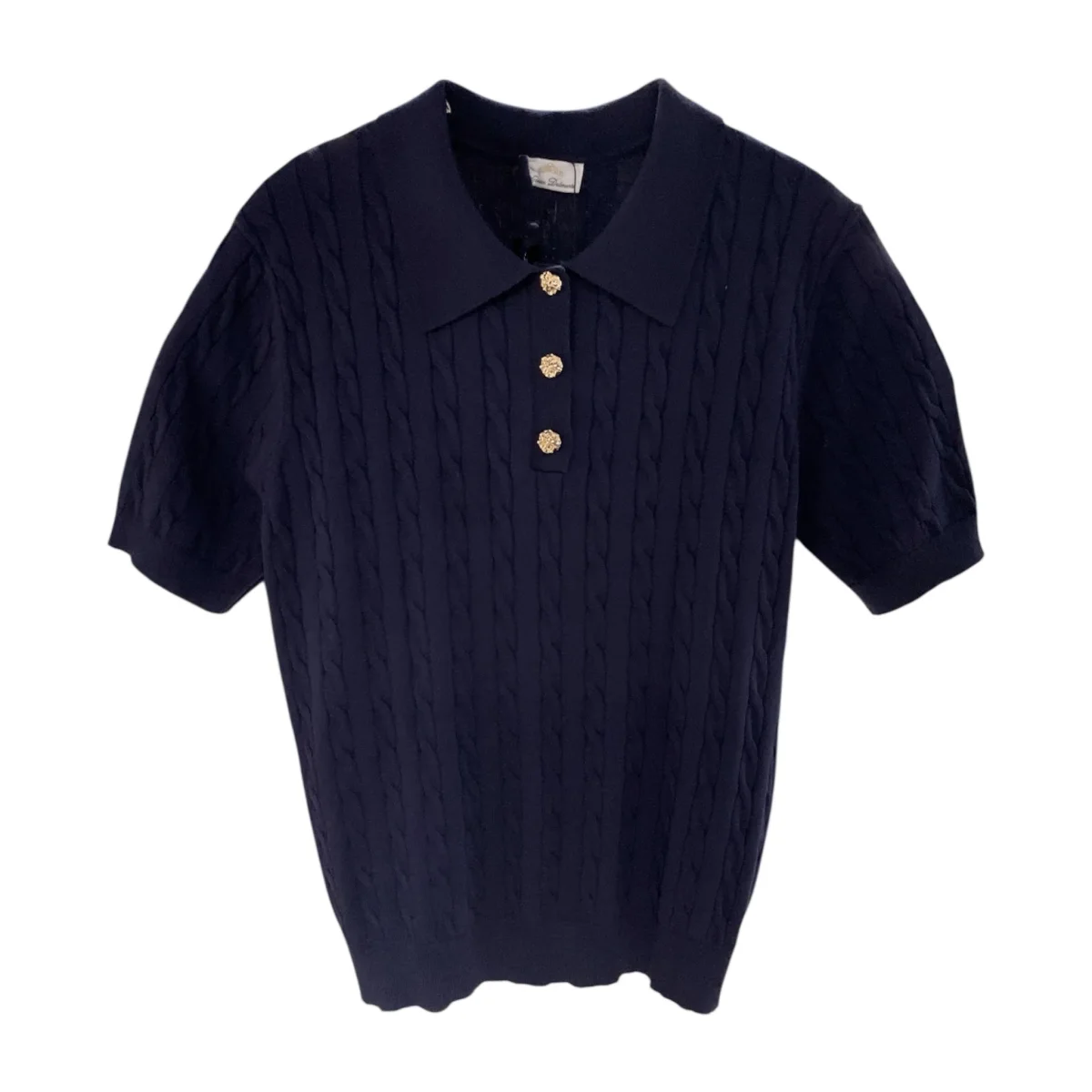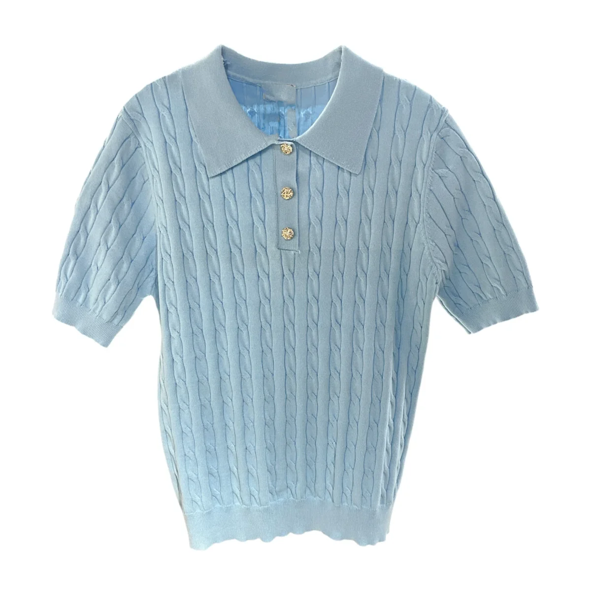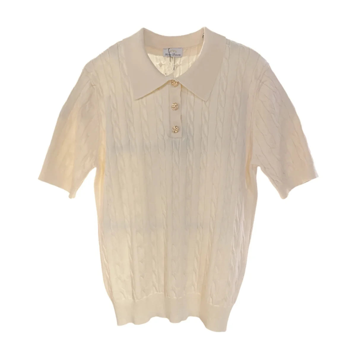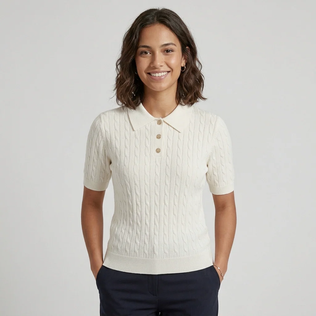 Polo donna maniche corte in tessuto misto viscosa. Colletto piccolo, bottoni gioiello. Maniche corte, motivo a trecce su tutta la lunghezza. Bordi e fondo rifiniti a costine. Composizione tessuto 70% viscosa 30% poliestere.