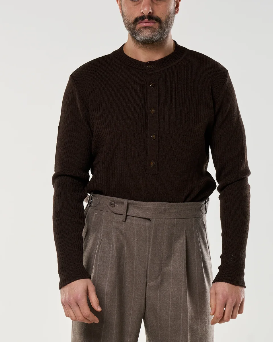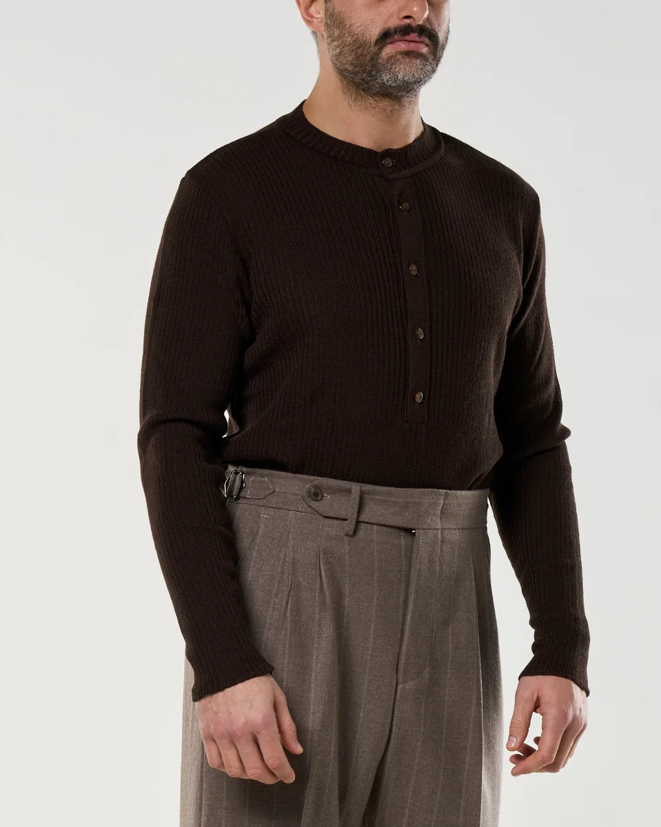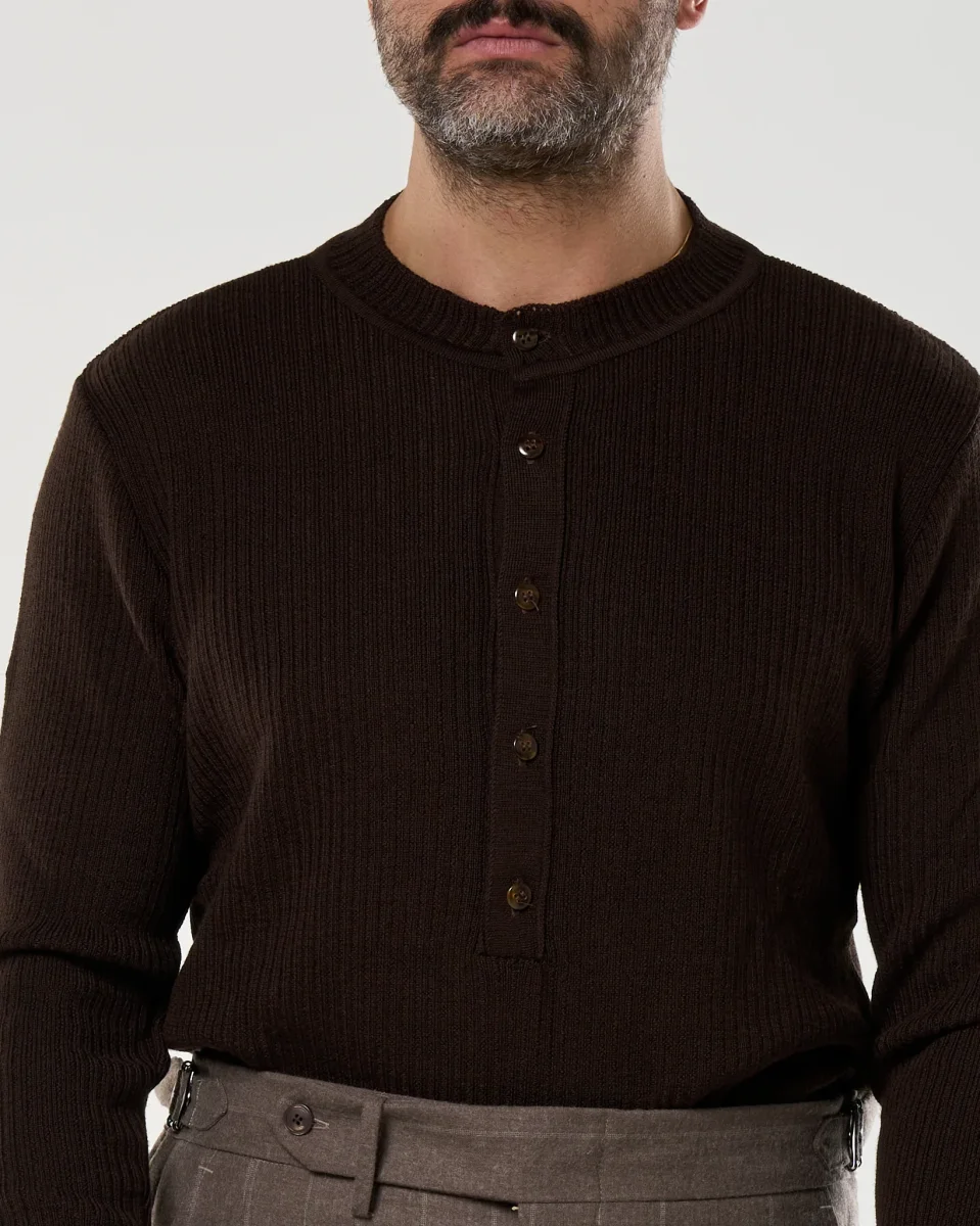 Maglia in filato di lana a coste sottili, con apertura Henley a cinque bottoni in tono naturale. Girocollo rinforzato, maniche lunghe e struttura compatta che garantisce comfort termico e ottima vestibilità. Un capo essenziale e versatile, perfetto come primo strato o sotto giacche e cappotti.