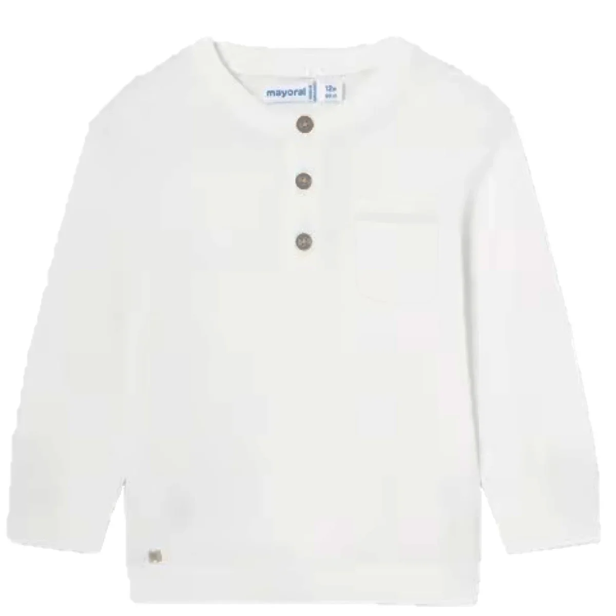 Maglione MAYORAL in cotone, modello con colletto serafino a maniche lunga , chiusura con bottoni e taschino sulla parte anteriore.