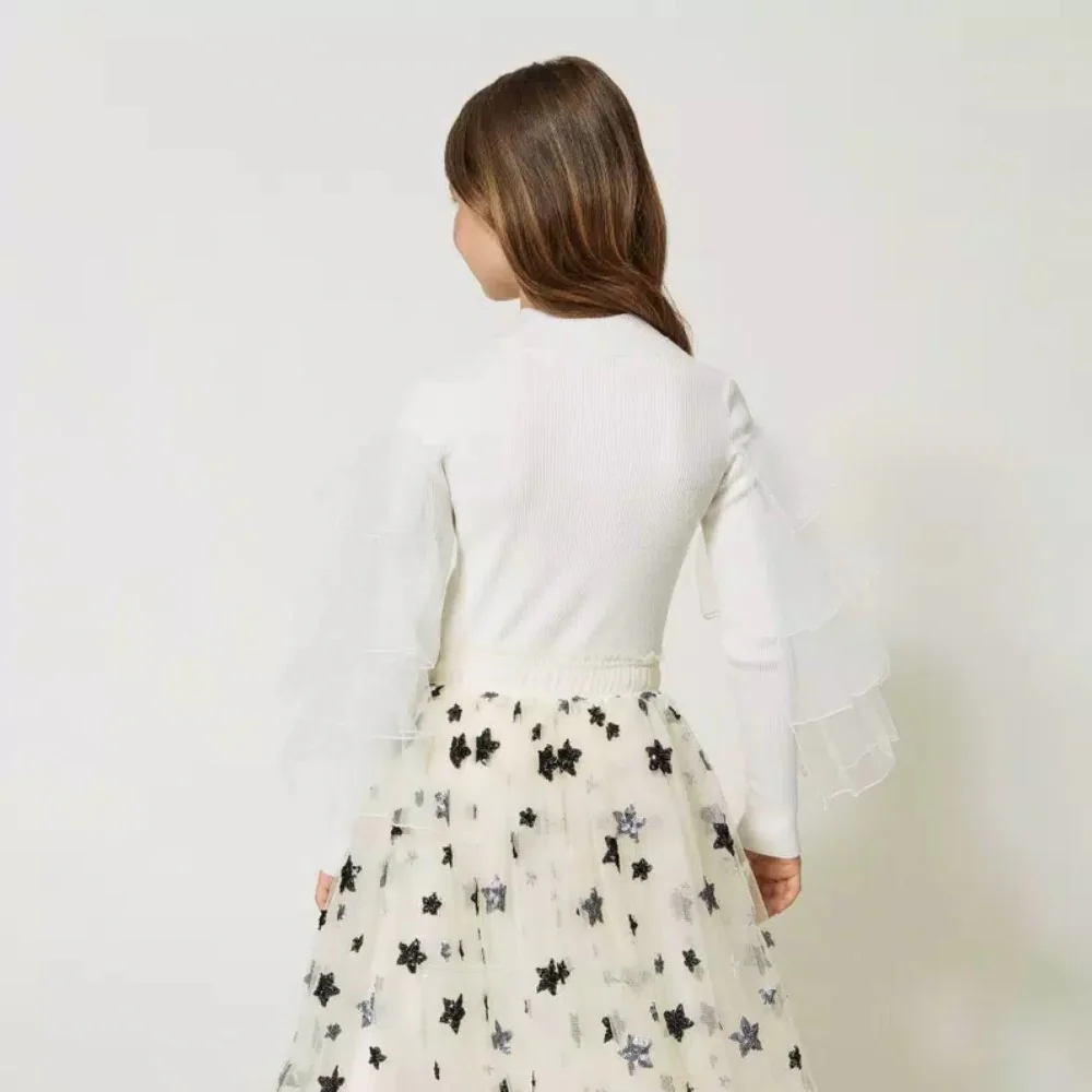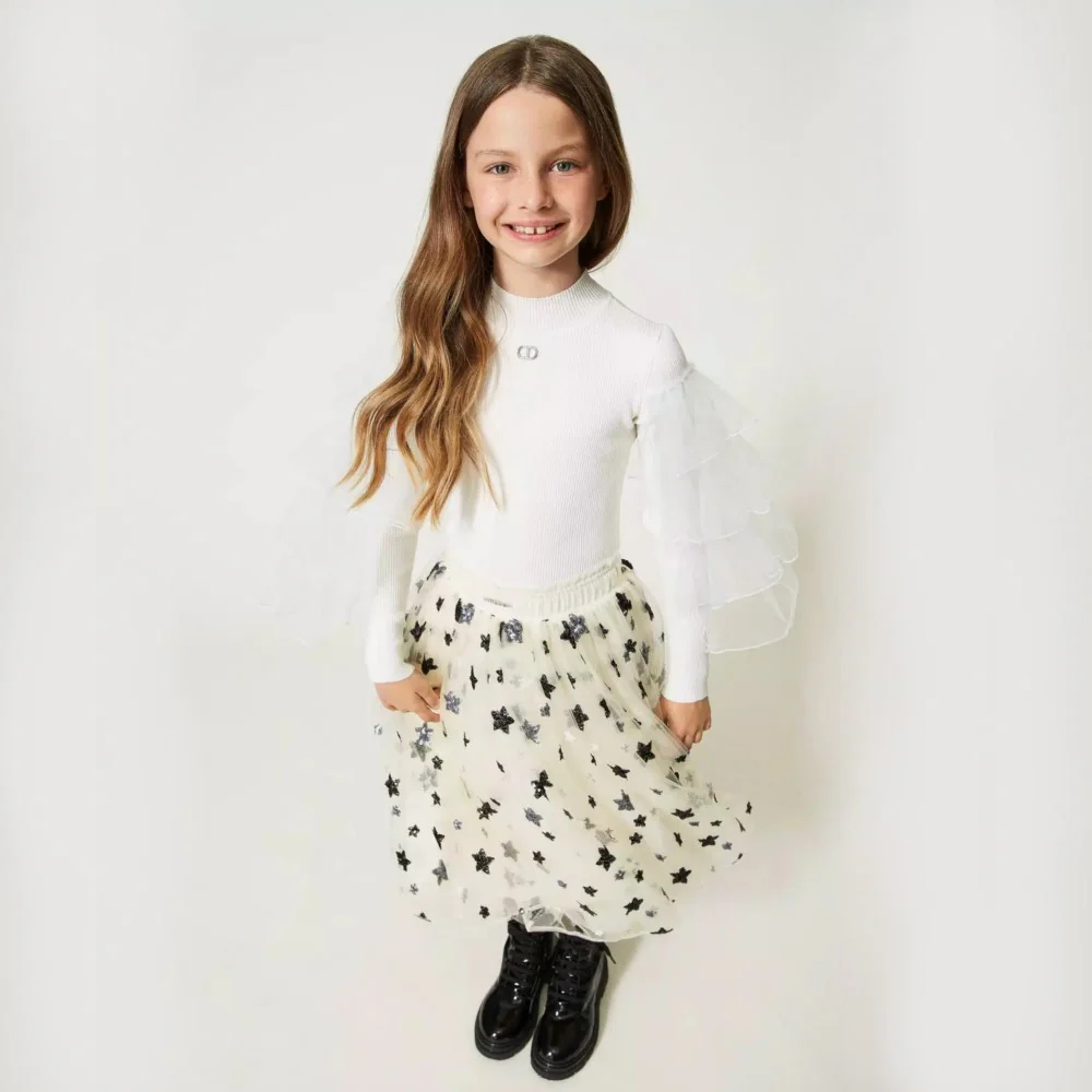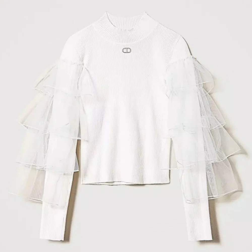 Maglioncino TWINSET a costine modello lupetto con balze in tulle alle maniche logo in metallo.