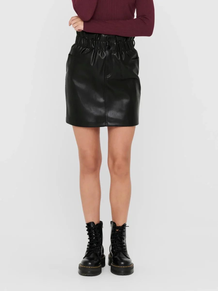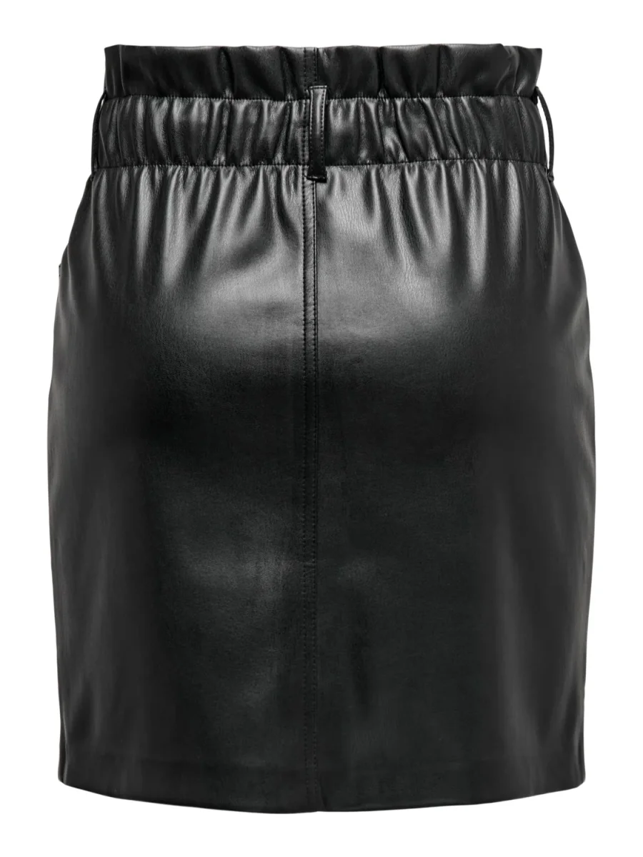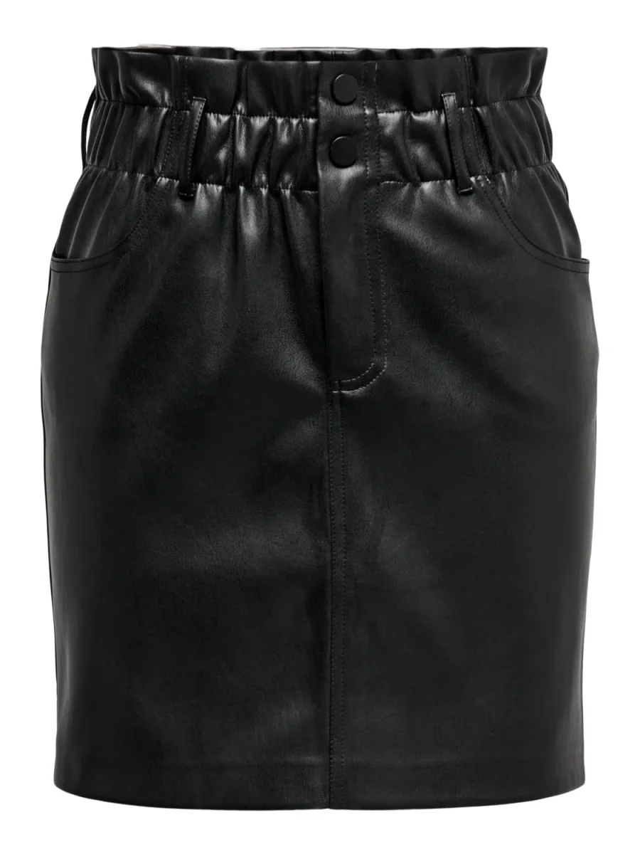 Gonna in ecopelle realizzata con materiali riciclati. Vita alta modello paperback con elastico, chiusura centrale con doppio bottone automatico e zip coperta. Tasche a filo laterali, vestibilit� aderente sui fianchi. Taglia in foto S. Composizione tessuto 50% poliestere riciclato, 50% poliestere.