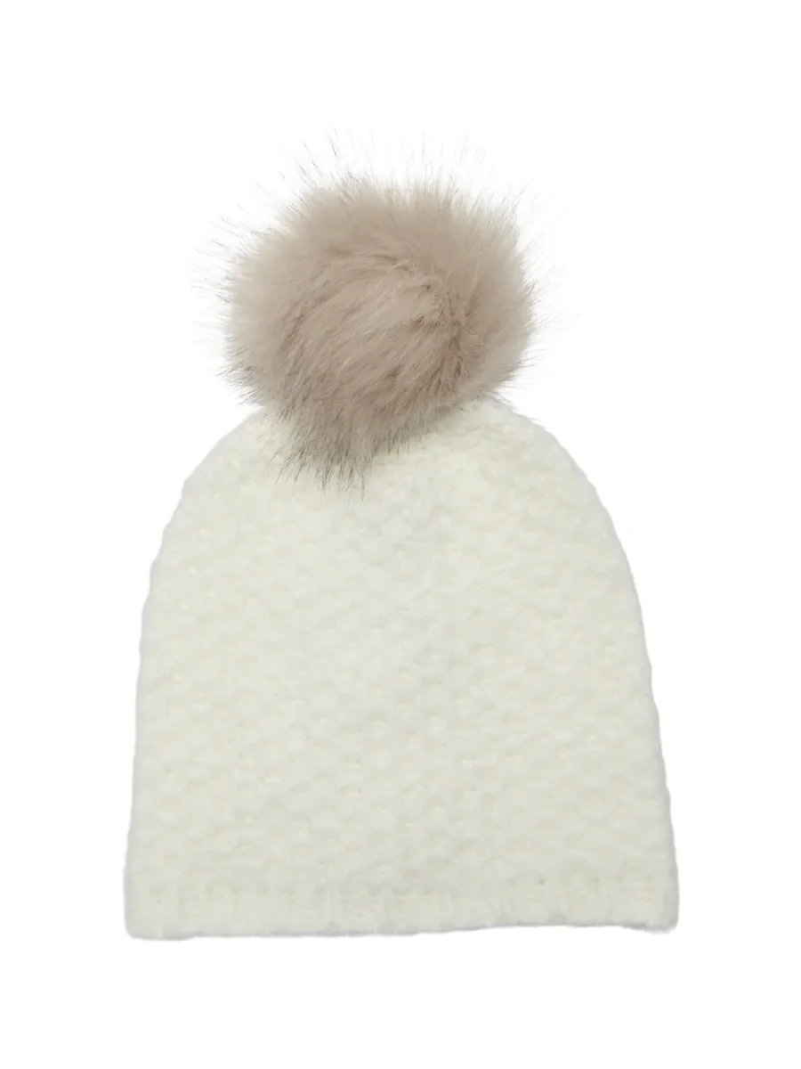 Cappello modello beanie in tessuto misto lana e materiali riciclati. Lavorazione del tessuto punto diamante. Pon-pon applicato in ecopelliccia. Composizione tessuto 53% poliestere riciclati, 38% acrilico, 7% lana, 2% elastan.