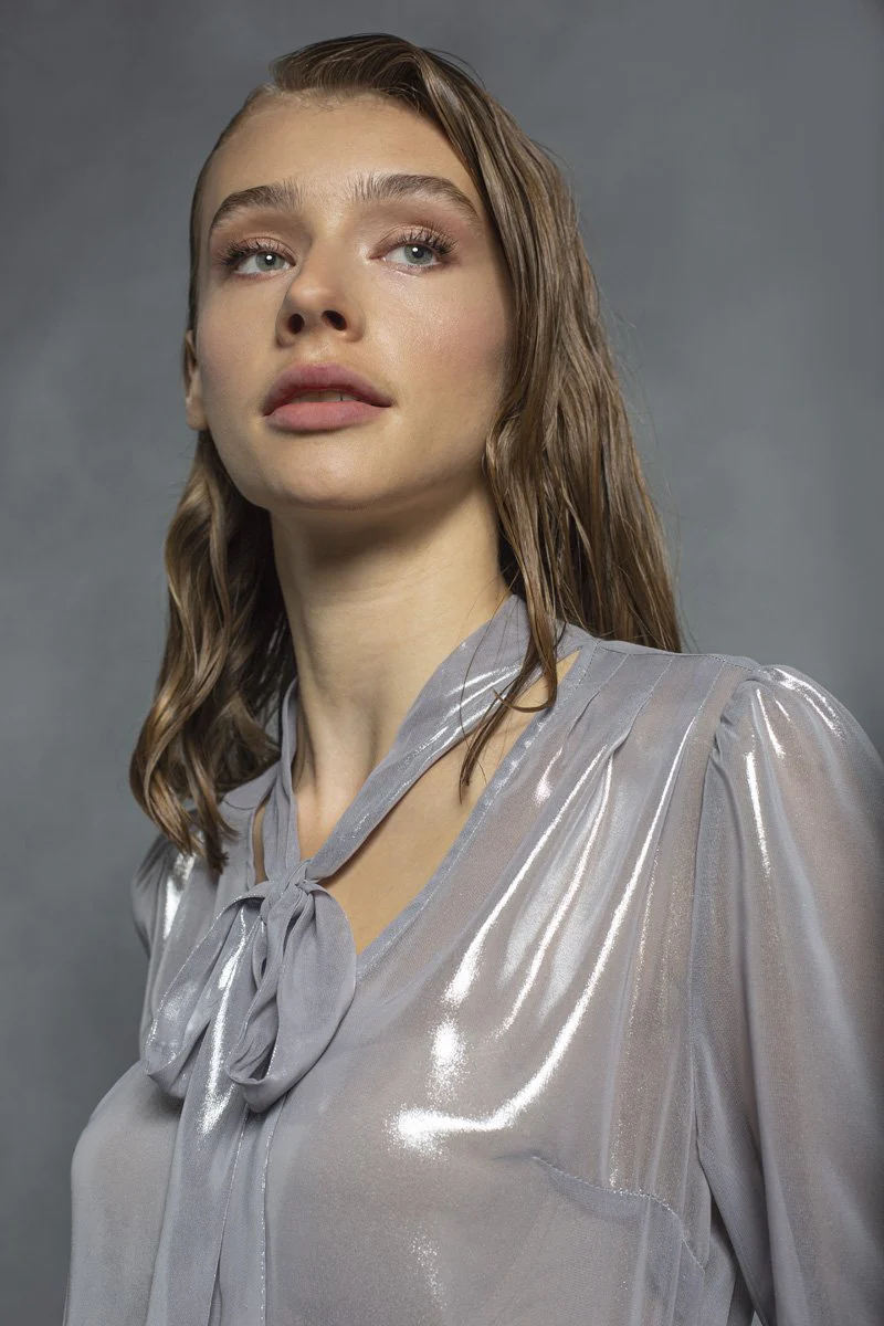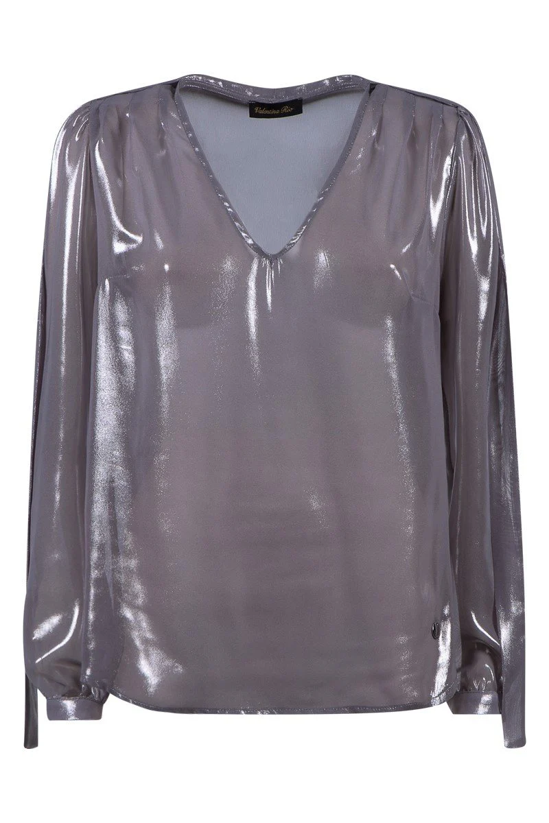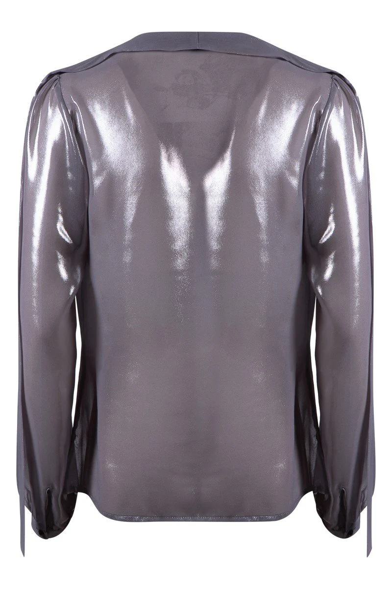 Camicia in chiffon effetto laminato. Scollo a V profilato, fusciacca da annodare al collo. Maniche lunghe con polsino stretto. Tessuto 100% poliestere.
