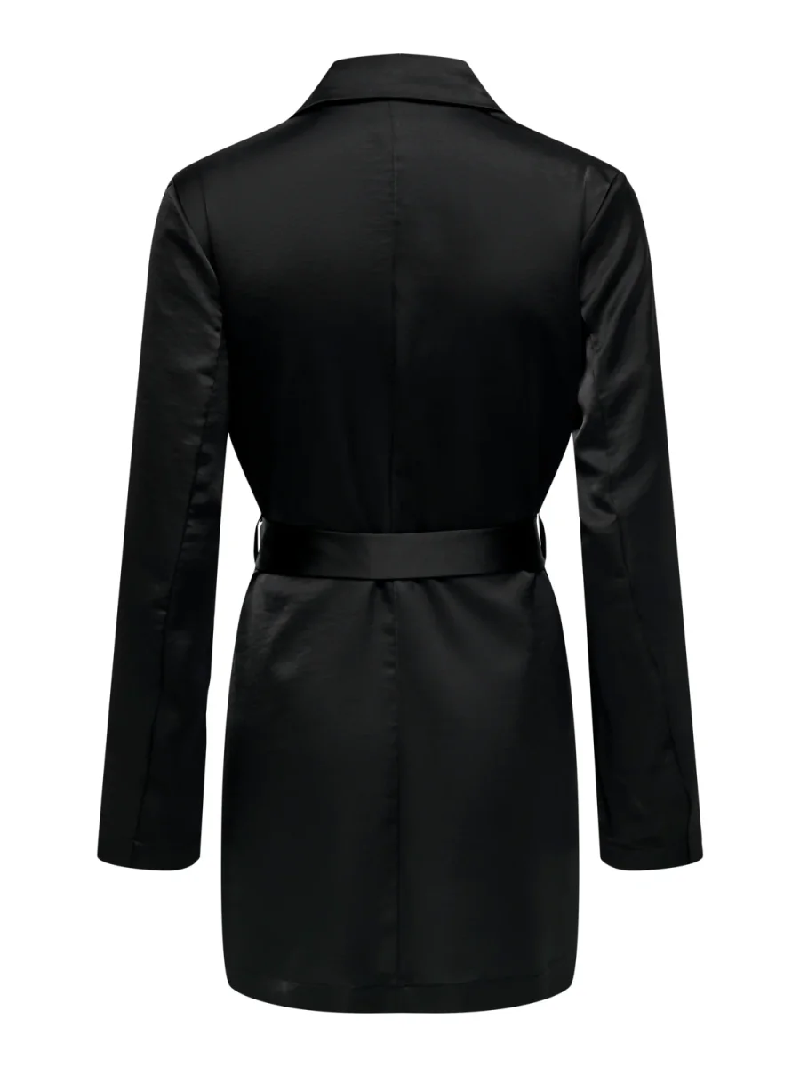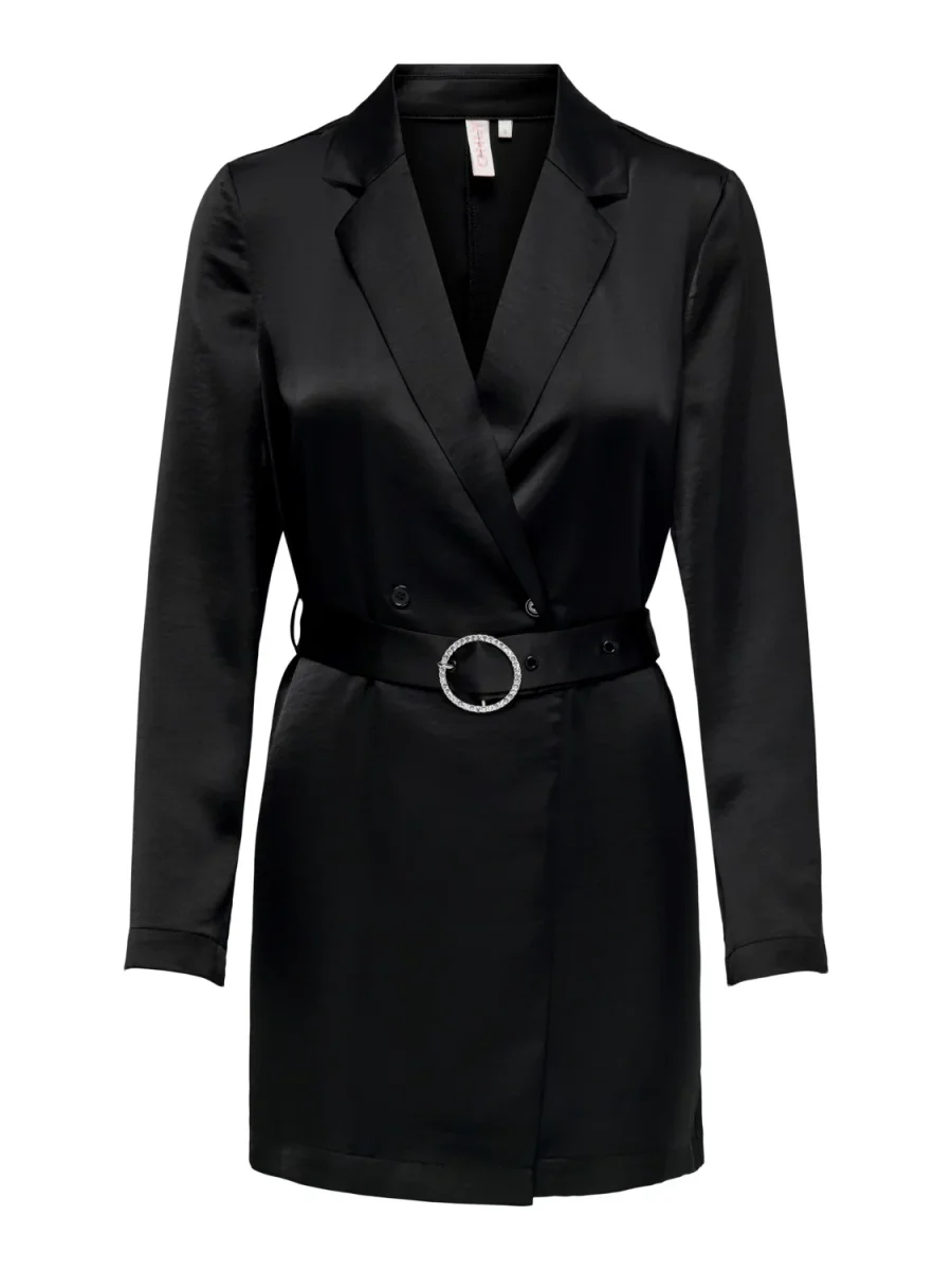 Vestito corto modello chemisier in tessuto raso lucido. Collo con revers classici, chiusura doppio petto con bottoni in tinta e cintura in vita con fibbia gioiello. Maniche lunghe. Vestibilit� regolare. Composizione tessuto 100% poliestere.