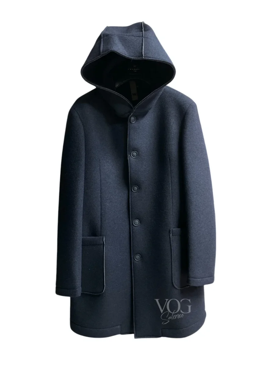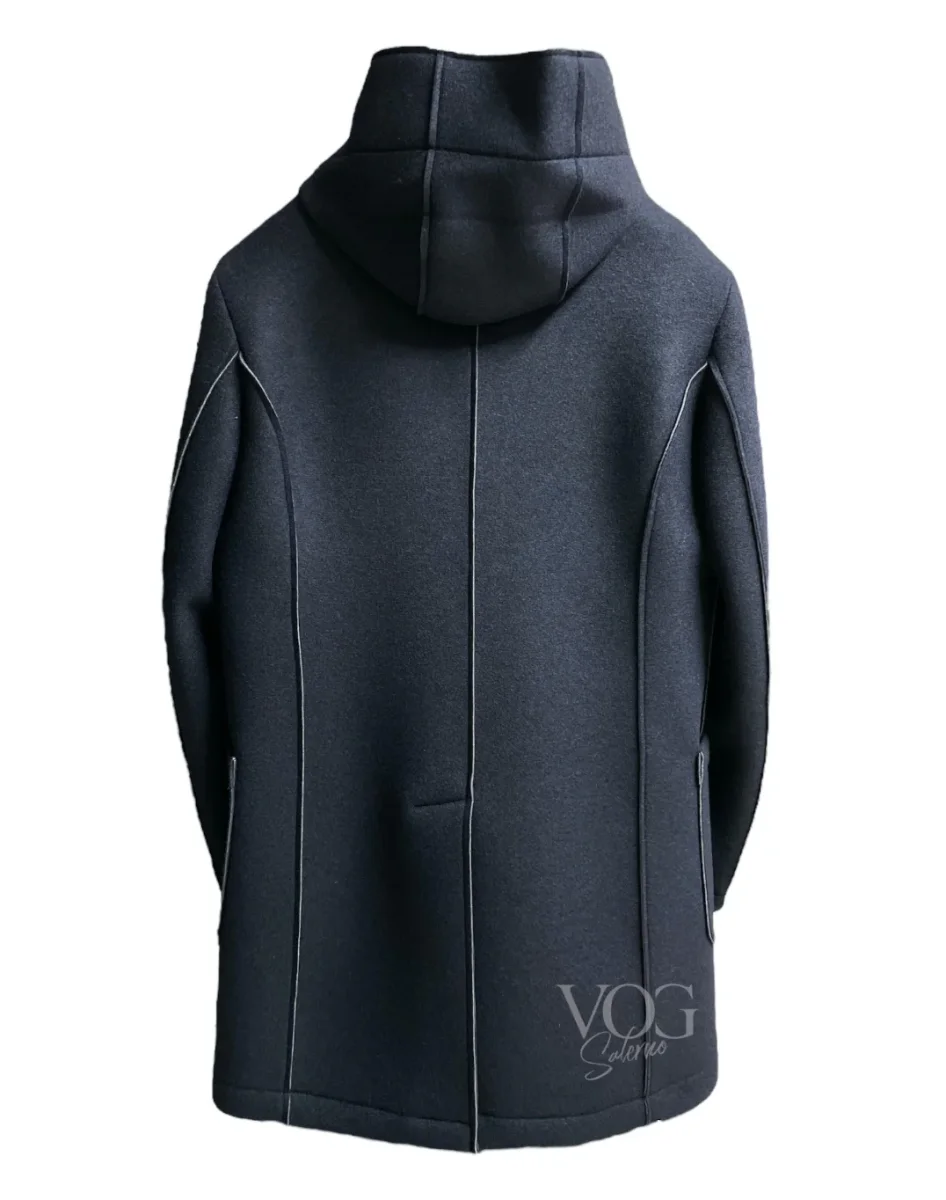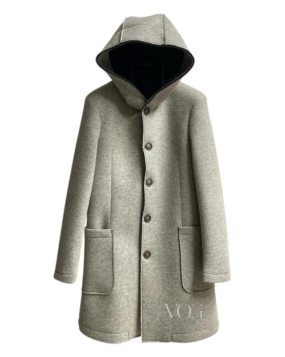 Giubbino lungo modello parka in tessuto lana cotta con bordi a taglio vivo. Ampio cappuccio, chiusura con bottoni in tinta. Tasche quadrate applicate. Bordi con tessuto a vista. Vestibilità regolare. Capo non foderato, interno tessuto scuba tecnico. Composizione tessuto 45% poliestere, 40% viscosa 15% lana vergine.