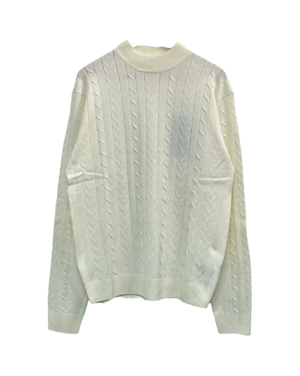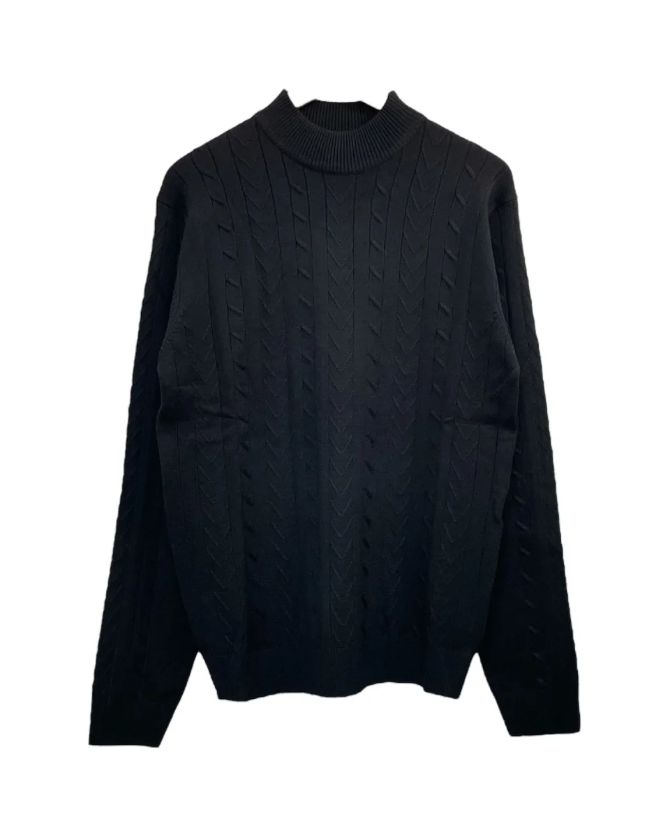 Maglia basica tessuto misto viscosa. Collo lupetto rifinito a costine, lavorazione in varie forme geometriche su tutta la lunghezza. Vestibilità regolare. Composizione tessuto 70% viscosa 30% nylon.