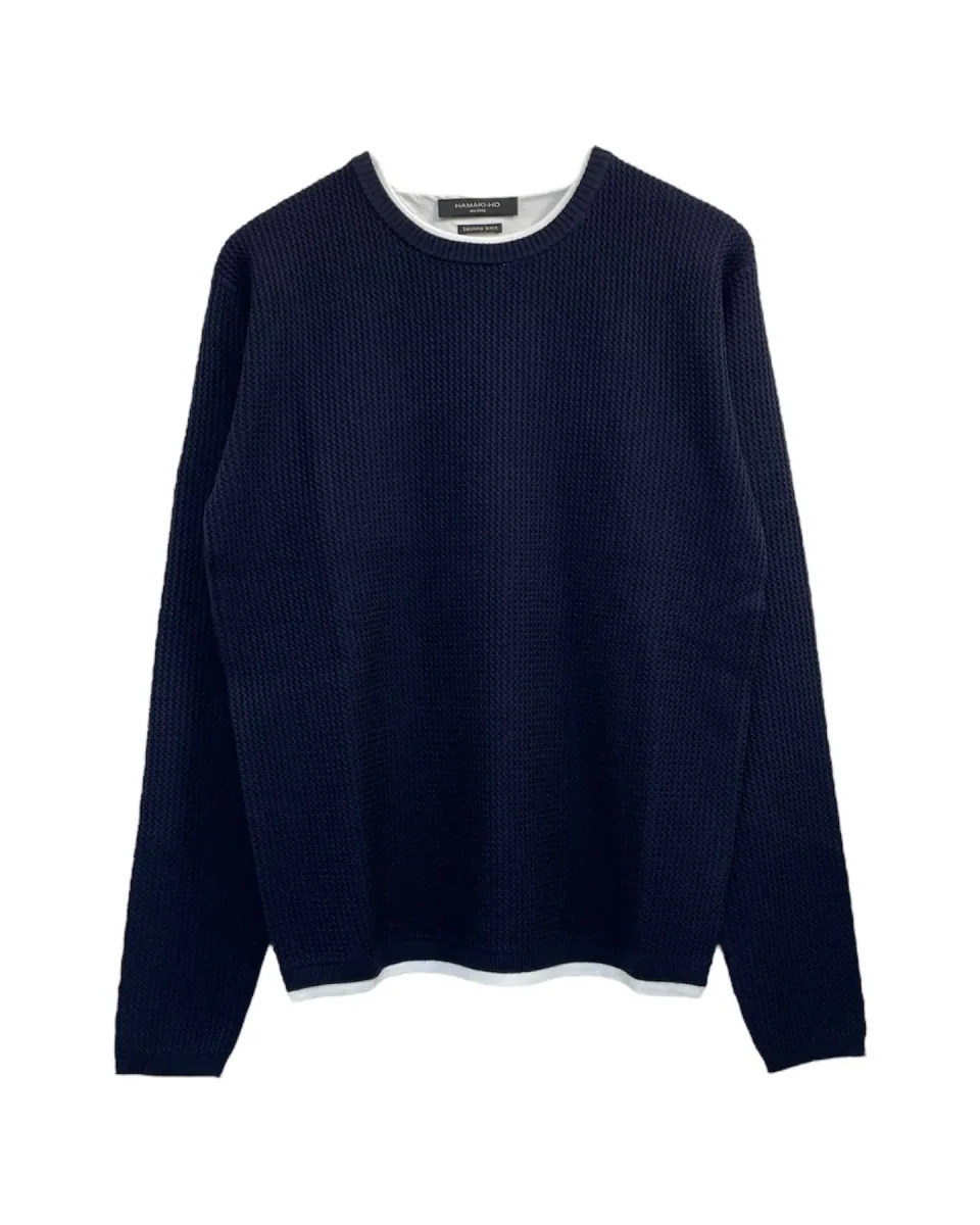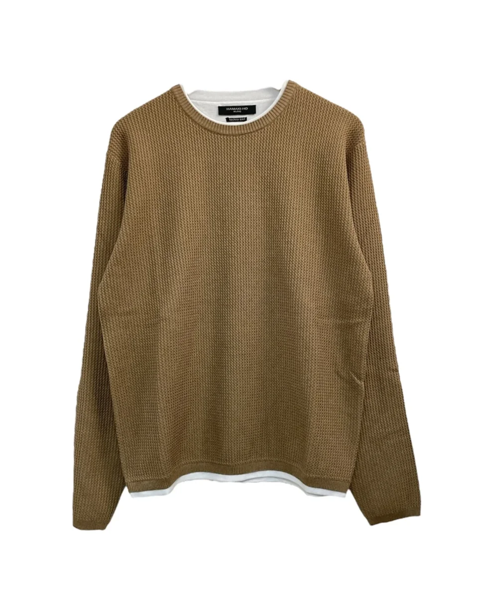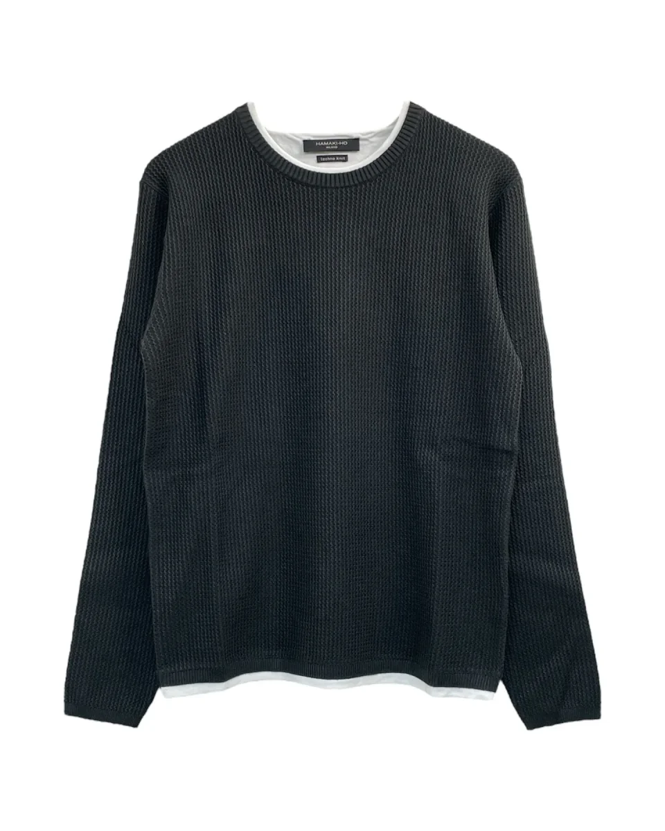 Maglia lavorata in tessuto misto viscosa. Girocollo regolare. Bordo interno al collo e sul fondo in tessuto effetto t-shirt. Tessuto lavorato zig-zag. Vestibilità regolare. Tessuto 70% viscosa 30% nylon.