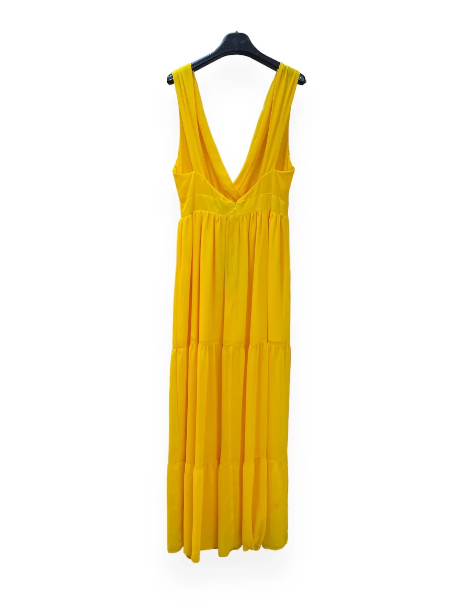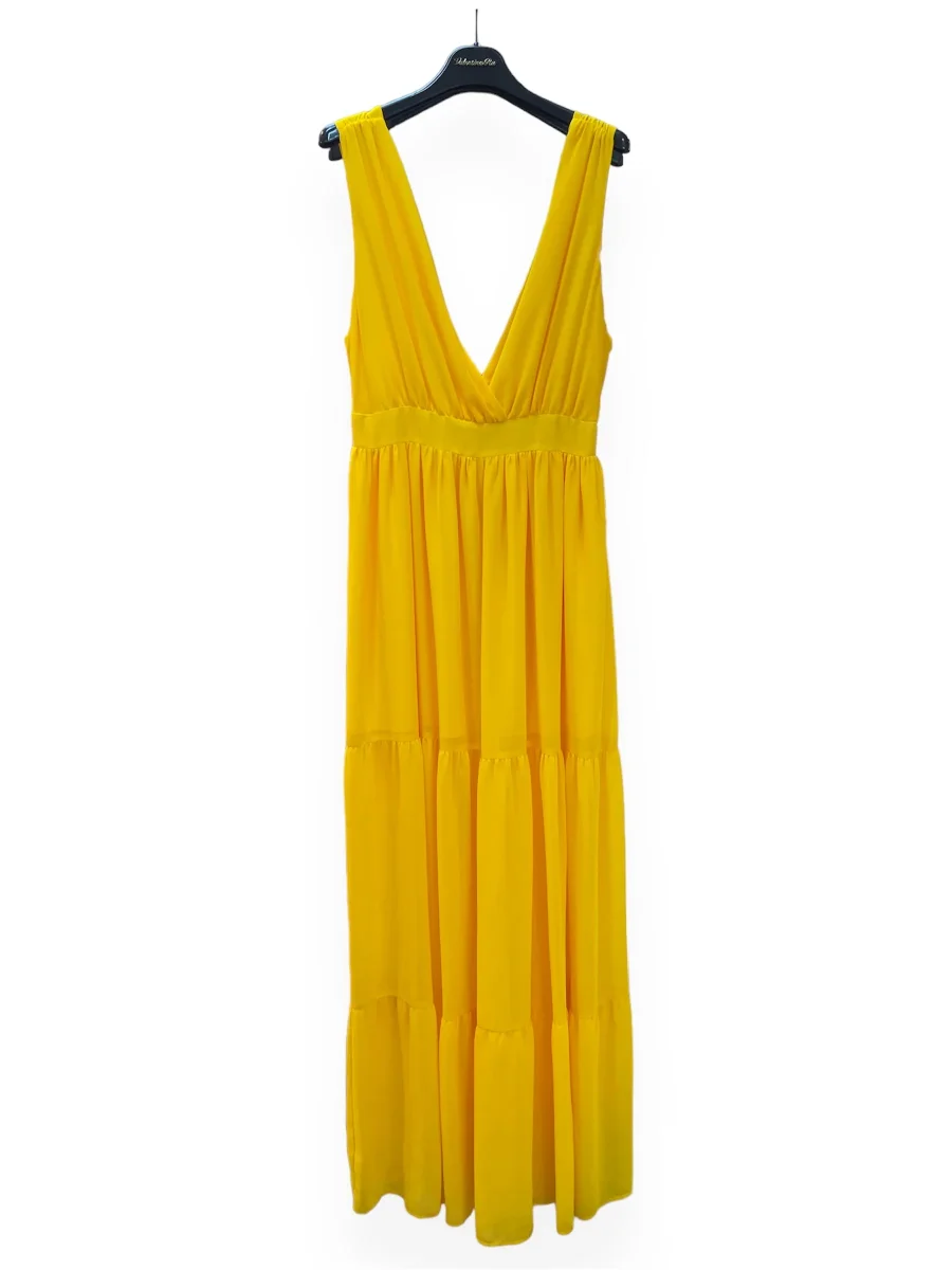 Vestito lungo in tessuto georgette. Scollo a punta profondo sul davanti e sulla schiena, fascia alta in vita. Chiusura con zip posteriore. Gonna lunga a balze. Vestibilità sagomata.