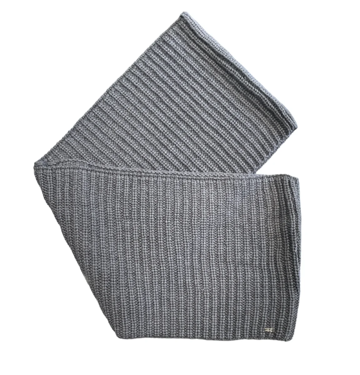 Sciarpa modello collo in tessuto lavorato a coste inglese. Logo metallico cucito sul bordo. Lunghezza 87 cm. Composizione tessuto 70% acrilico 30% nylon.