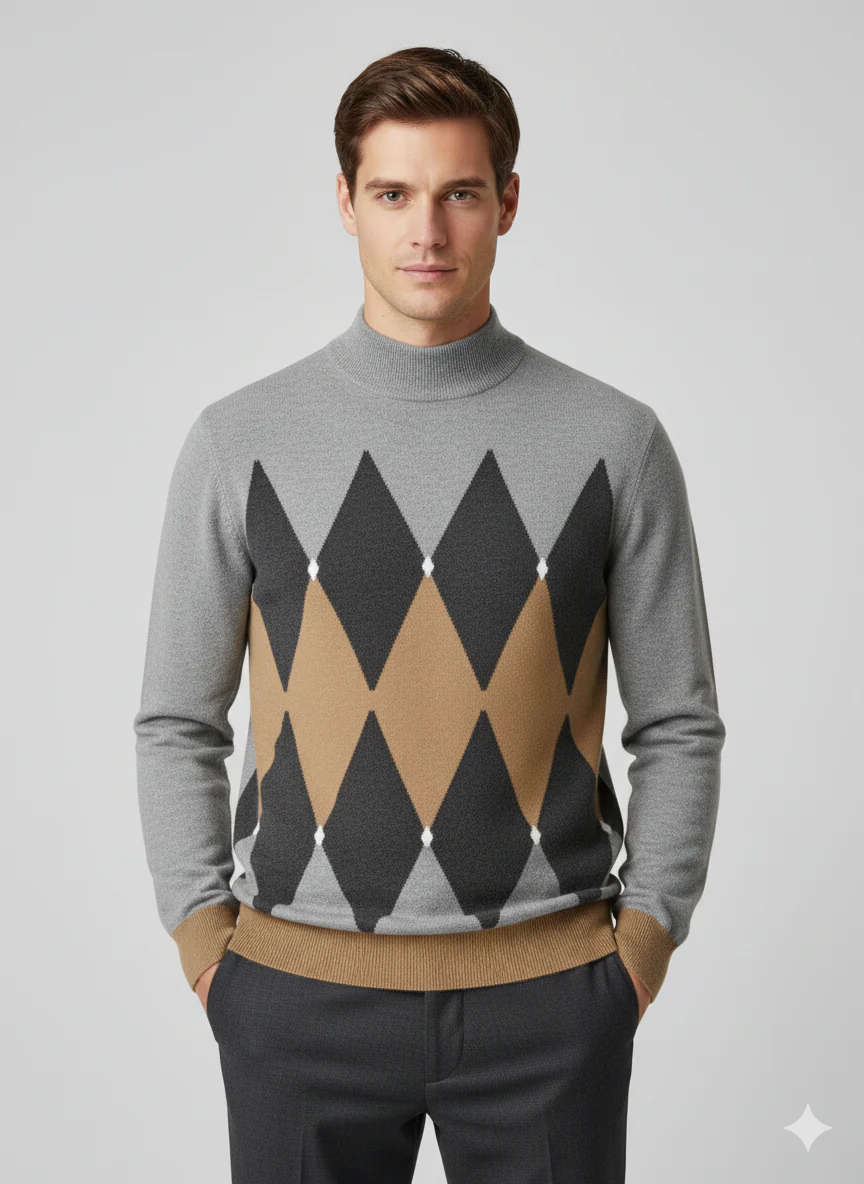 Maglia uomo in morbido tessuto soft touch. Collo lupetto rifinito a canaletti, maniche lunghe. Motivo rombi sul davanti, logo brand cucito sul fondo. Bordi rifiniti a canaletti. Vestibilità slim. Composizione tessuto 80% viscosa 20% nylon.