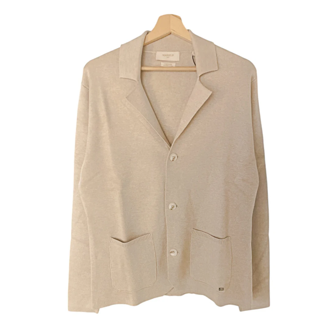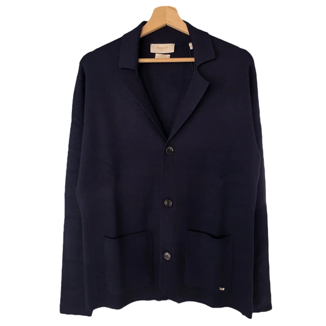 Giacca uomo in tessuto maglina punto milano. Collo aperto con revers, chiusura con bottoni con logo brand. Tasche quadrate applicate, vestibilità regolare. Composizione tessuto 80% viscosa 20% nylon.