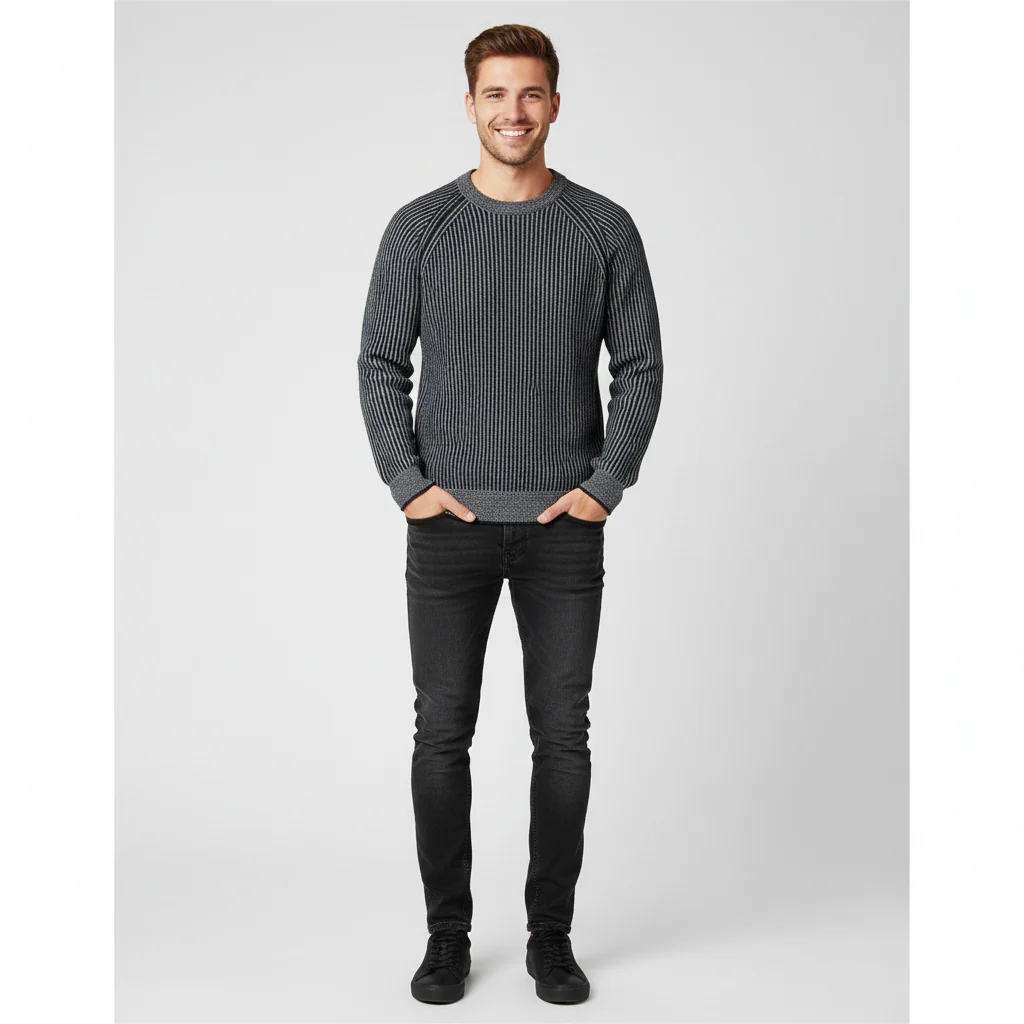 Maglia uomo in tessuto misto lana motivo costa inglese. Girocollo regolare, polsini e fondo rifiniti a zig-zag. Lavorazione vanisé doppio colore. Vestibilità regolare. Composizione tessuto 70% acrilico 30% lana.