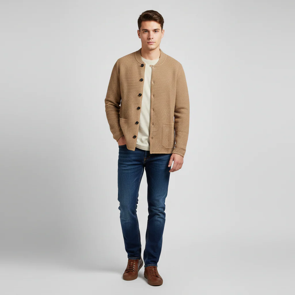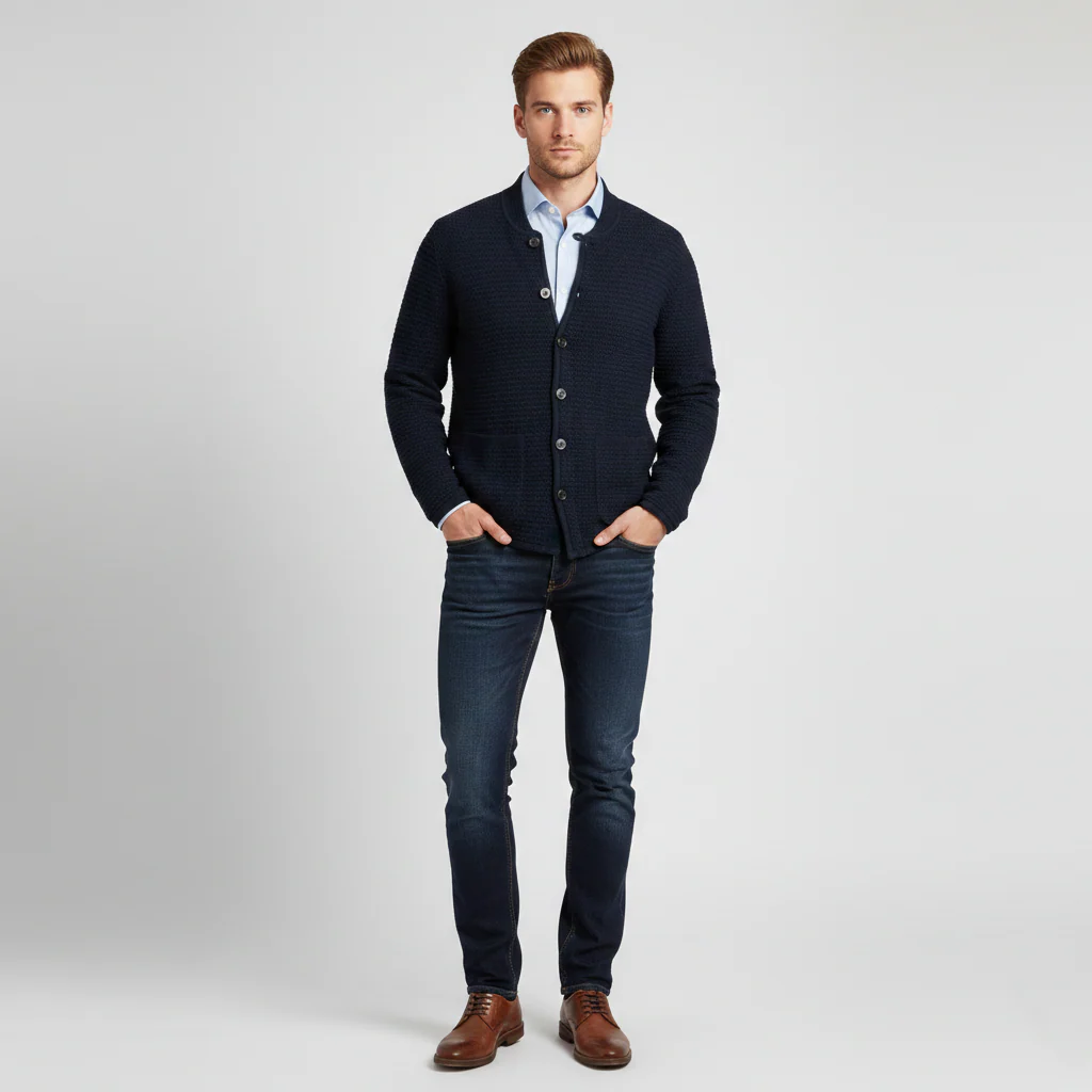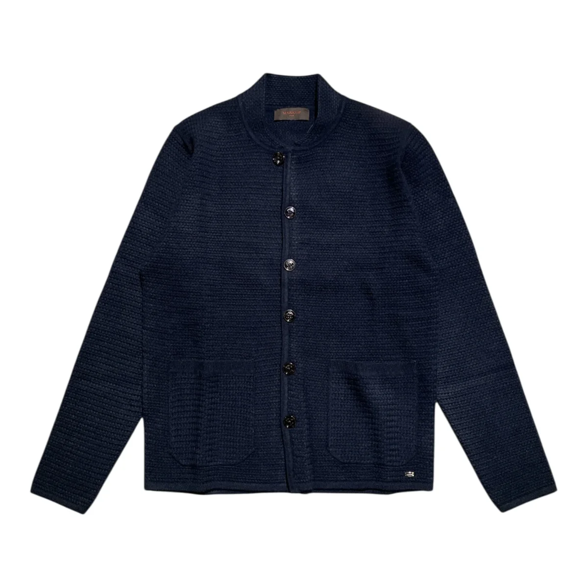 Cardigan uomo in tessuto lavorato punto riso effetto intrecciato. Collo pistagna, primo bottone chiuso con occhiello e restanti chiusi con asola classica. Bordi in tessuto liscio, tasche applicate, logo brand cucito sul fondo. Vestibilità regolare. Composizione tessuto 70% acrilico 30% nylon.