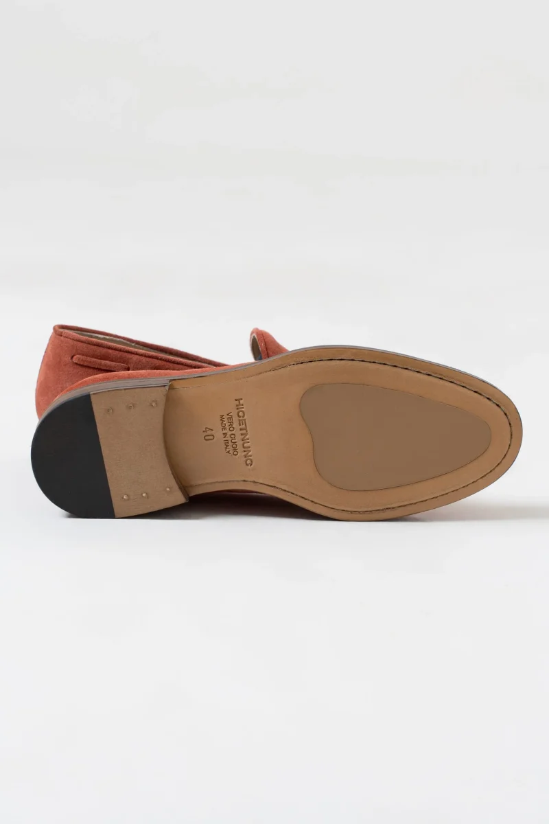 Mocassino con tomaia scamosciata , fodera in vitello, suola in cuoio con antiscivolo in gomma.