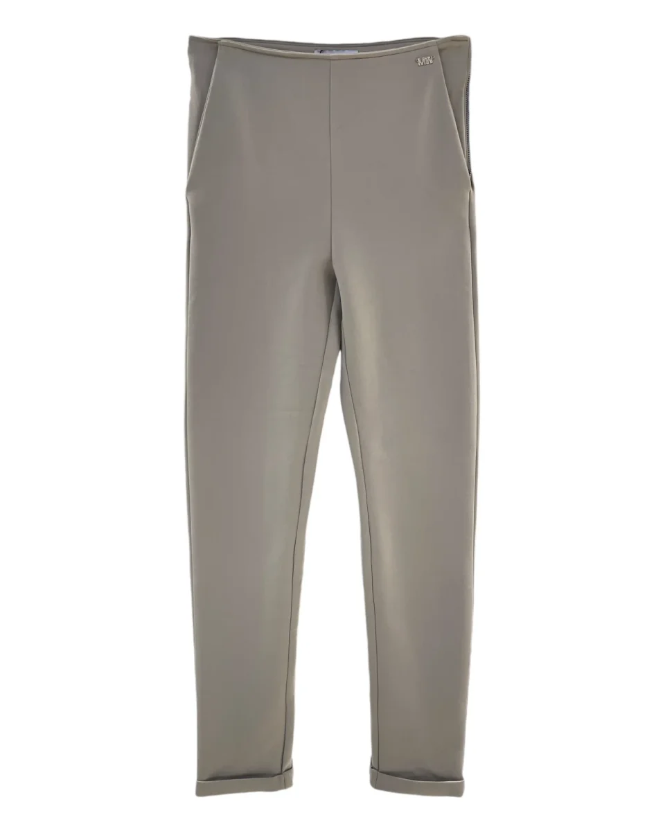 Pantalone skinny fit modello leggings tessuto punto milano elasticizzato. Vita alta, chiusura con zip metallica laterale. Logo brand cucito, tasche a filo laterali. Gamba e fondo stretti, piega con risvolto. Composizione tessuto 72% viscosa 23% nylon 5% elastan.