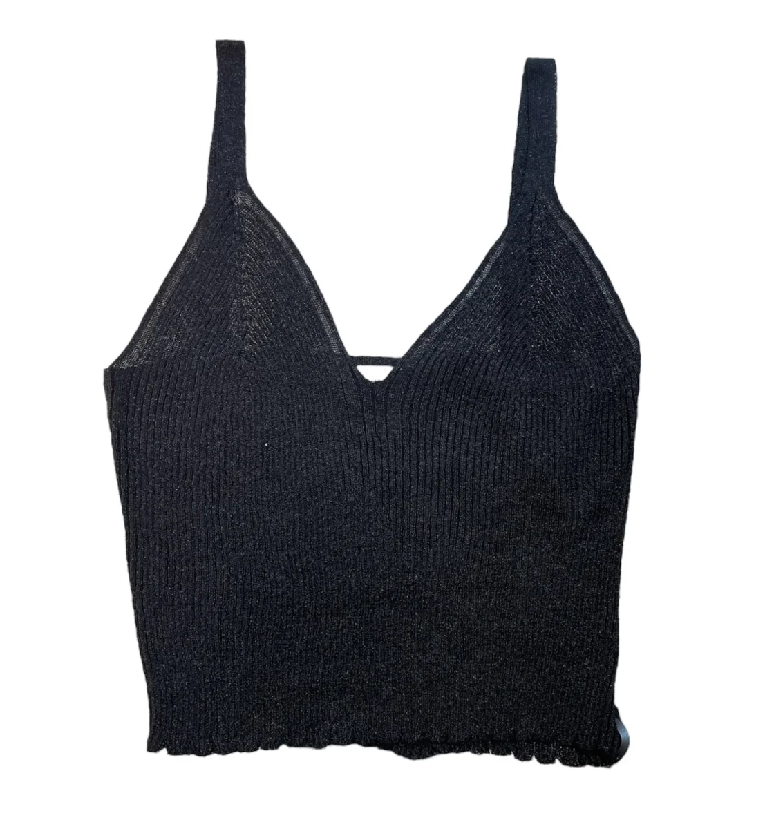 Top in tessuto maglia lavorata misto viscosa. Inserti in lurex colore tono su tono. Bretelle sottili, scollo a V traforato. Fondo rifinito ad onde. Vestibilità aderente. Crea il twin-set con il cardigan abbinato. Composizione tessuto 80% viscosa 20% lurex.