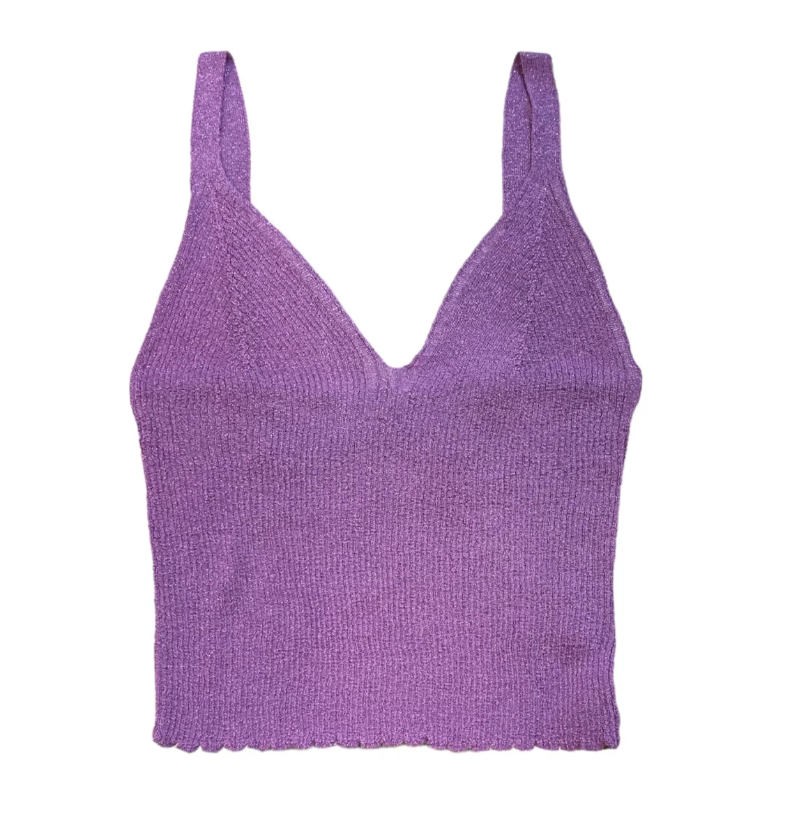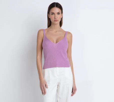 Top in tessuto maglia lavorata misto viscosa. Inserti in lurex colore tono su tono. Bretelle sottili, scollo a V traforato. Fondo rifinito ad onde. Vestibilità aderente. Crea il twin-set con il cardigan abbinato. Composizione tessuto 80% viscosa 20% lurex.