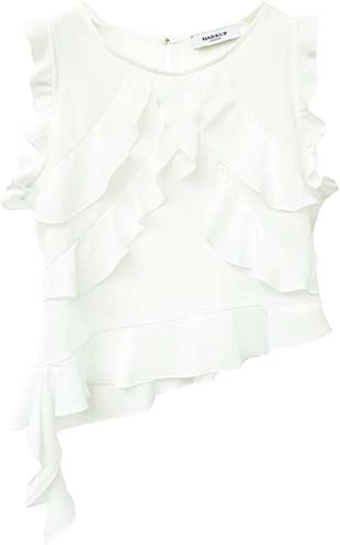 Top corto modello crop in tessuto leggero georgette. Scollo tondo, chiusura con bottone gioiello sul collo. Dettaglio rouches su tutta la parte anteriore. Fondo asimmetrico con rouche laterale. Vestibilità slim regolare.
