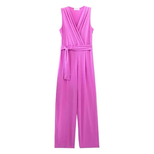 Tuta molto versatile in tessuto jersey elasticizzato. Scollo a V ad incrocio, chiusura con bottone gioiello sulla schiena. Fusciacca in tessuto in tinta per modulare la vestibilità. Fascia alta in vita, pences e cavallo basso. Gamba e fondo ampi. Vestibilità comoda. Consigliamo di acquistare una taglia in meno in quanto questo capo veste ampio.