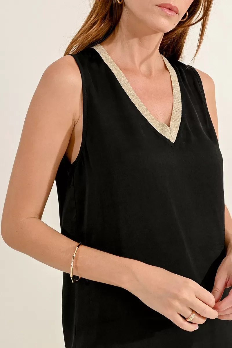 Top basico in tessuto fluido. Scollo a punta con bordo in tessuto lurex dorato, vestibilità dritta. Comodo da utilizzare da solo o come sottogiacca. Vestibilità regolare. Taglia in foto S. Composizione tessuto 100% poliestere.