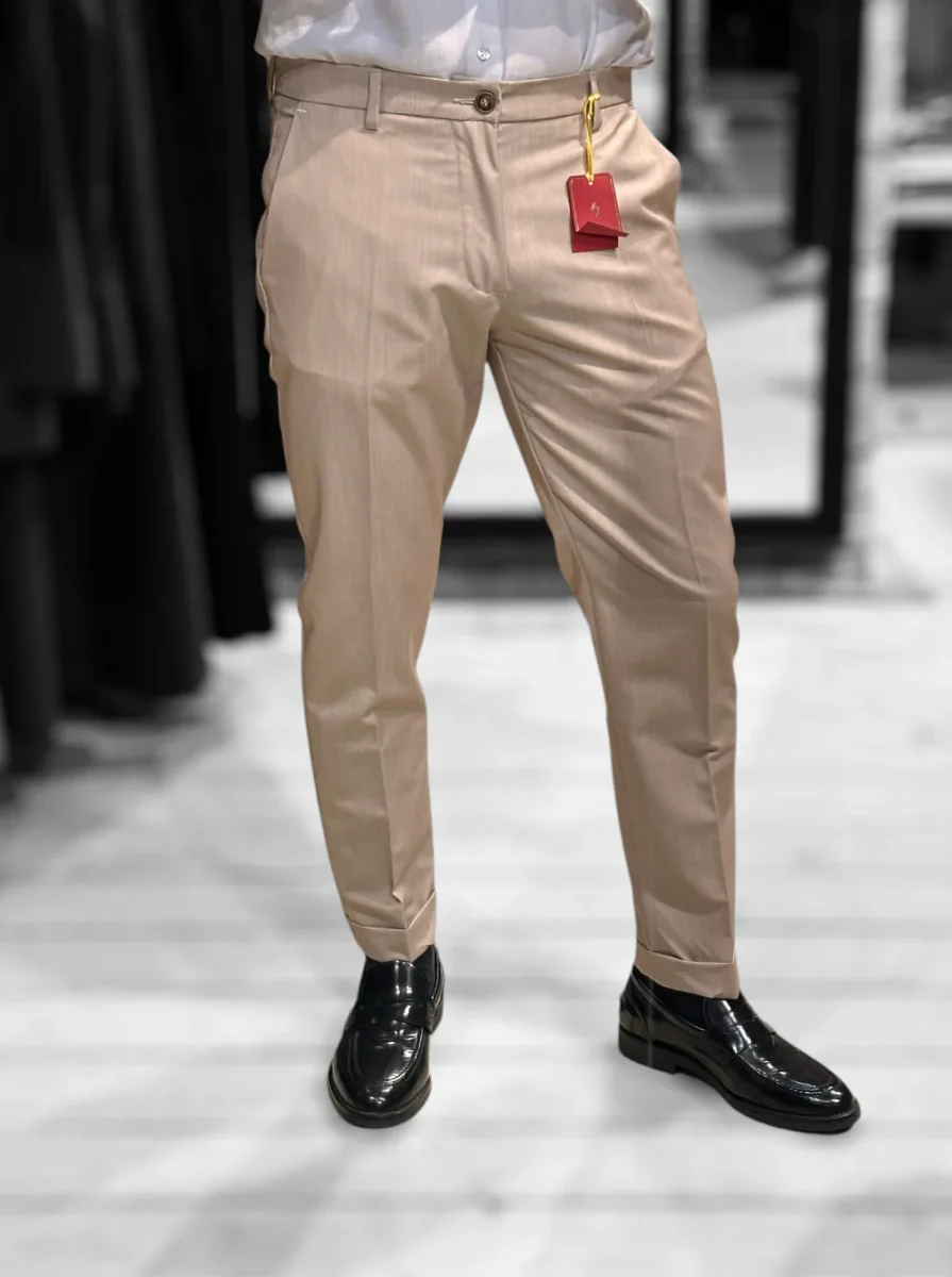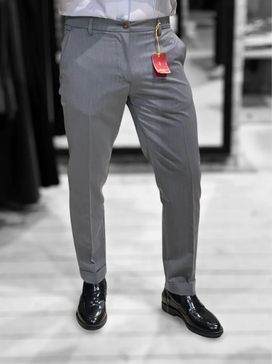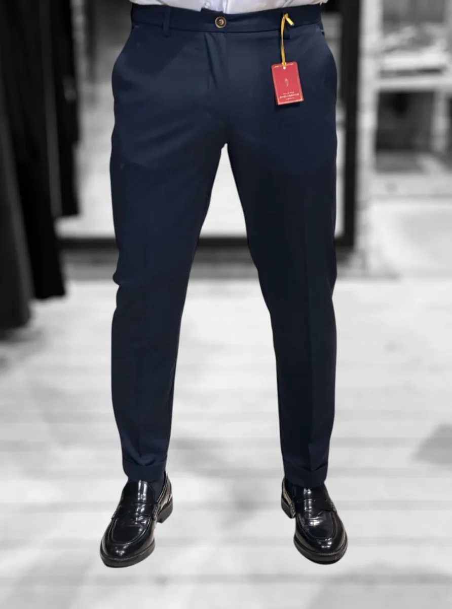 Il nostro modello di pantaloni più venduto. Vita regolare, cinturino fisso con passanti, chiusura con zip e bottone. Tasche a filo laterali, tasche a filetto posteriori. Gamba slim asciutta e fondo stretto con piega con risvolto, lunghezza capri. Un pantalone adatto ad ogni occasione e ad ogni outfit. Taglia in foto 46. Composizione tessuto 75% poliestere 20% rayon 5% elastan.