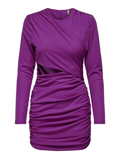 Vestito corto in tessuto tecnico elasticizzato. Girocollo morbido, chiusura sulla schiena con zip invisibile. Maniche lunghe. Drappeggio su tutta la lunghezza e sullo scollo, apertura laterale. Vestibilit� aderente. Taglia in foto S. Composizione tessuto 100% poliestere.