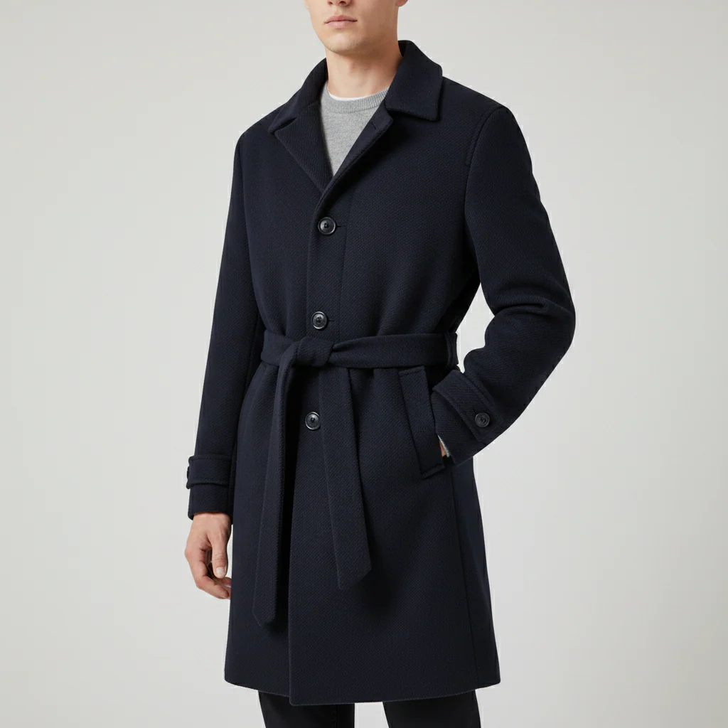 Cappotto uomo lunghezza midi in tessuto panno lavorato diagonale. Collo camicia, chiusura con bottoni in tinta e cintura in vita. Tasche laterali con bordo alto. Vestibilità regolare. Composizione tessuto 100% poliestere.