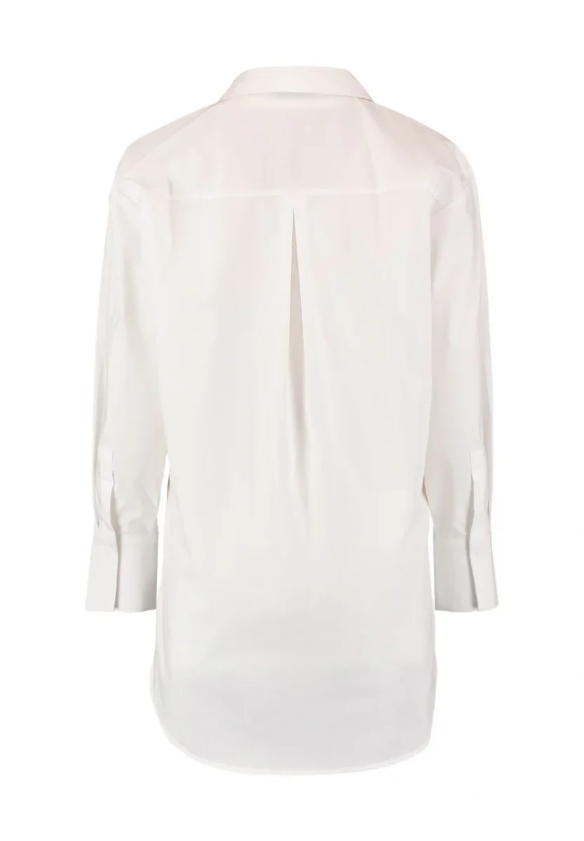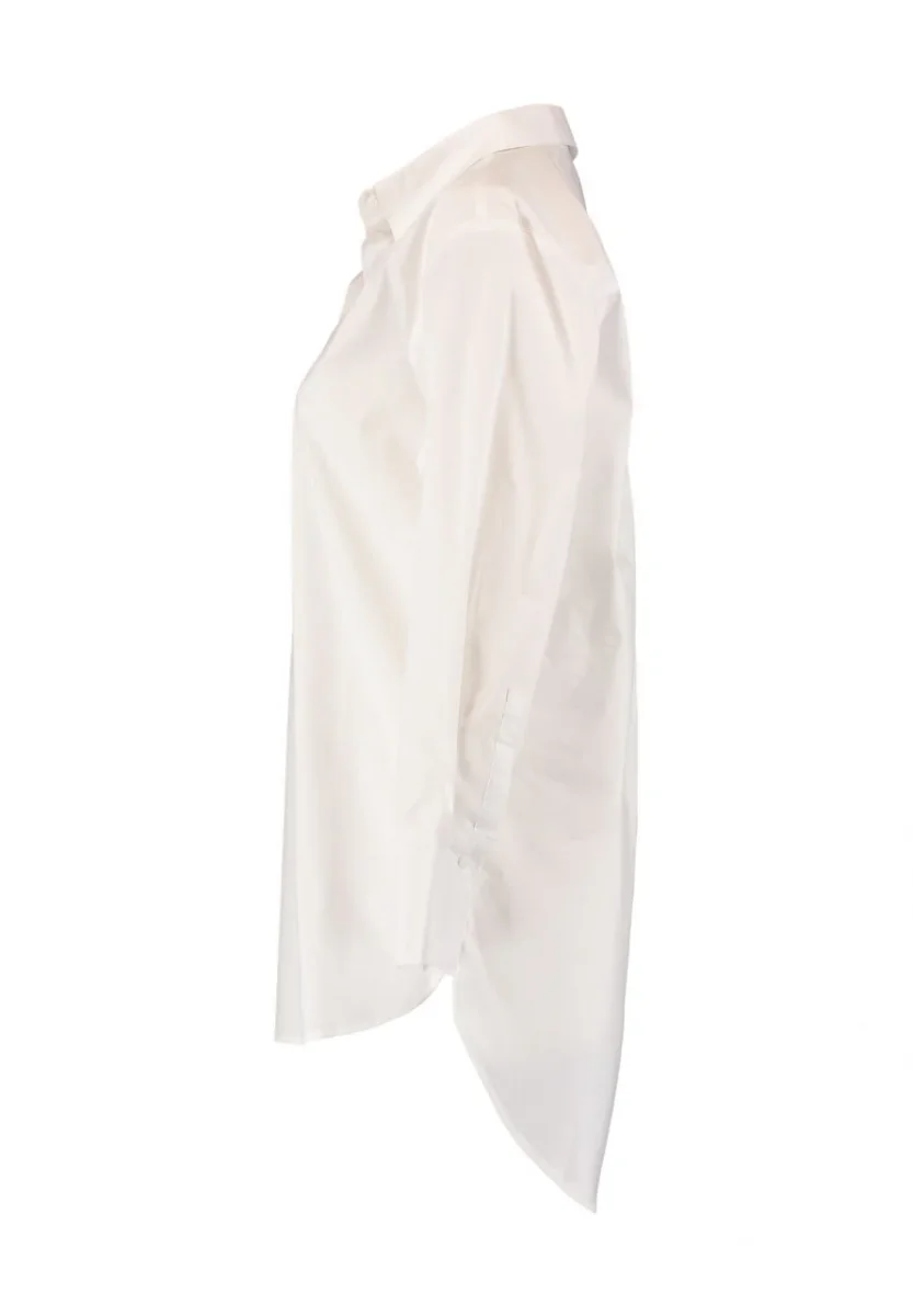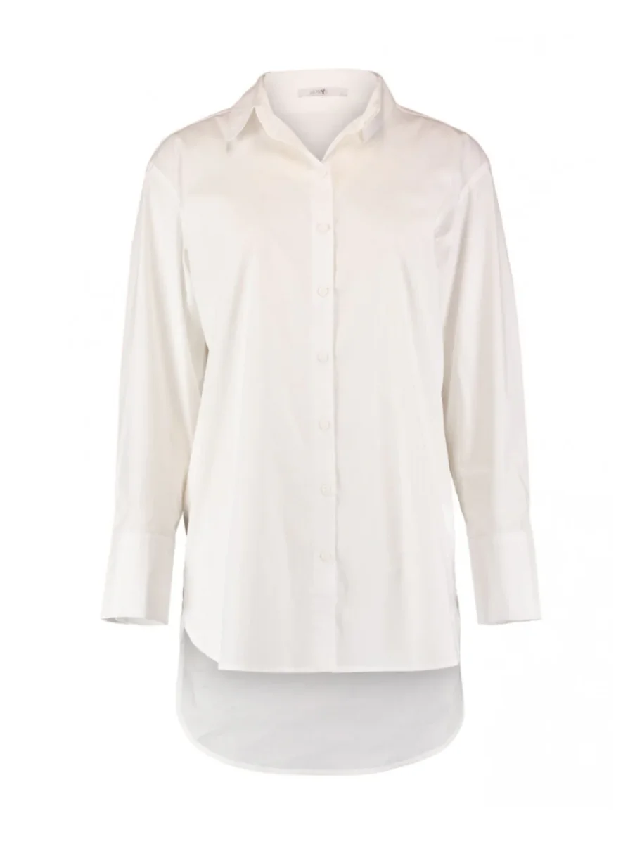 Camicia lunga oversize in tessuto misto cotone elasticizzato. Colletto piccolo, chiusura con bottoni in tinta. Maniche lunghe. Vestibilità comoda. Composizione tessuto 74% cotone, 24% poliestere 4% elastan.
