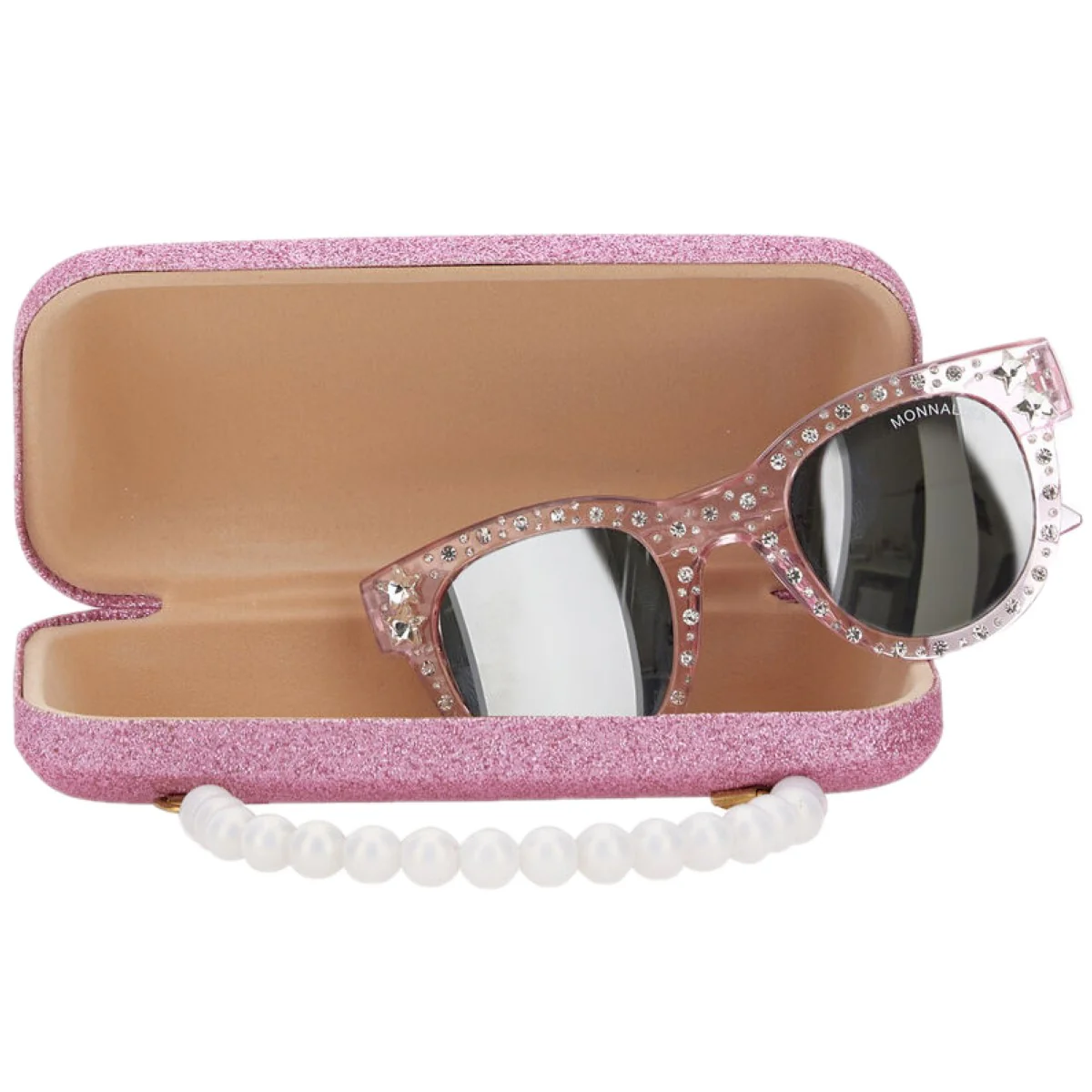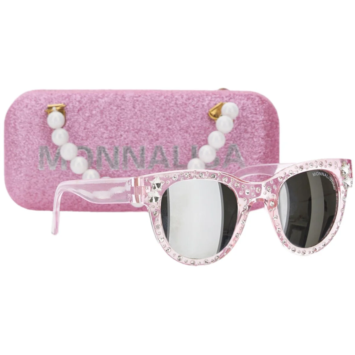Occhiali MONNALISA con strass applicati, vetro specchiato, fodera portaocchiali in glitter logato con manico in perline UV 400 PROTECTION.