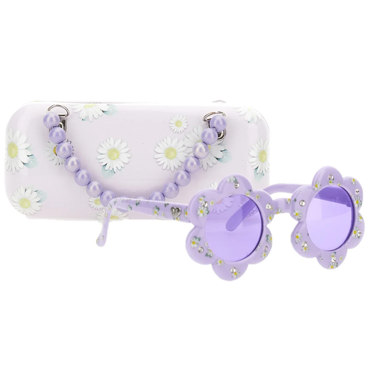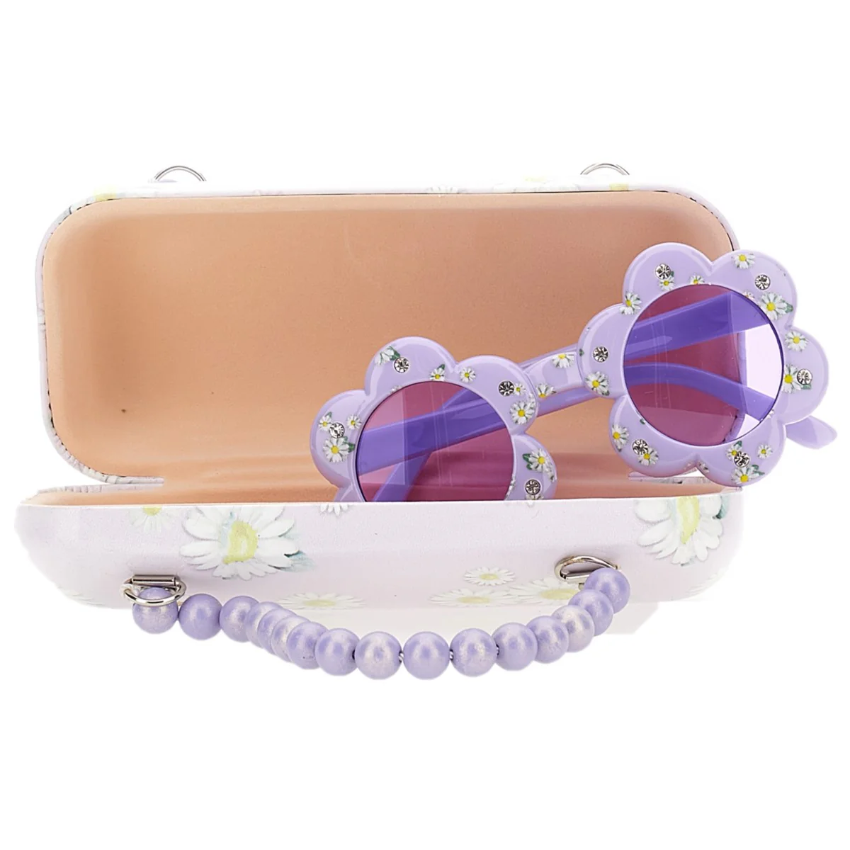 Occhiali MONNALISA con strass applicati, cuoricini logati in metallo applicati ai lati, fodera porta occhiali a fantasia con logo stampato applicato e manici in perline. UV 400 PROTECTION.