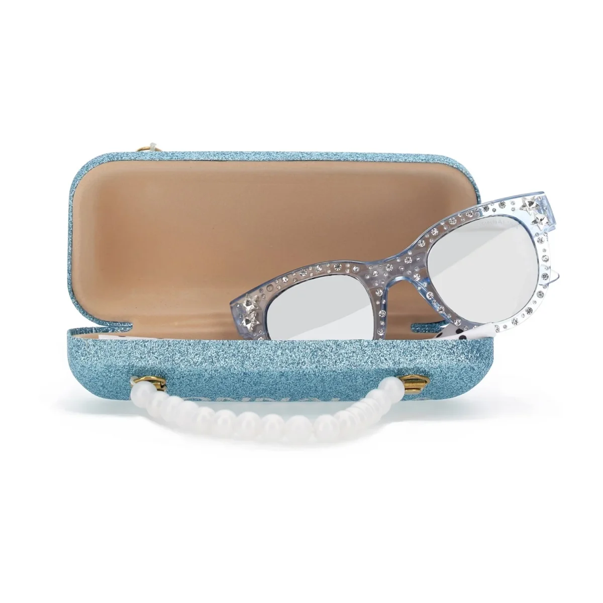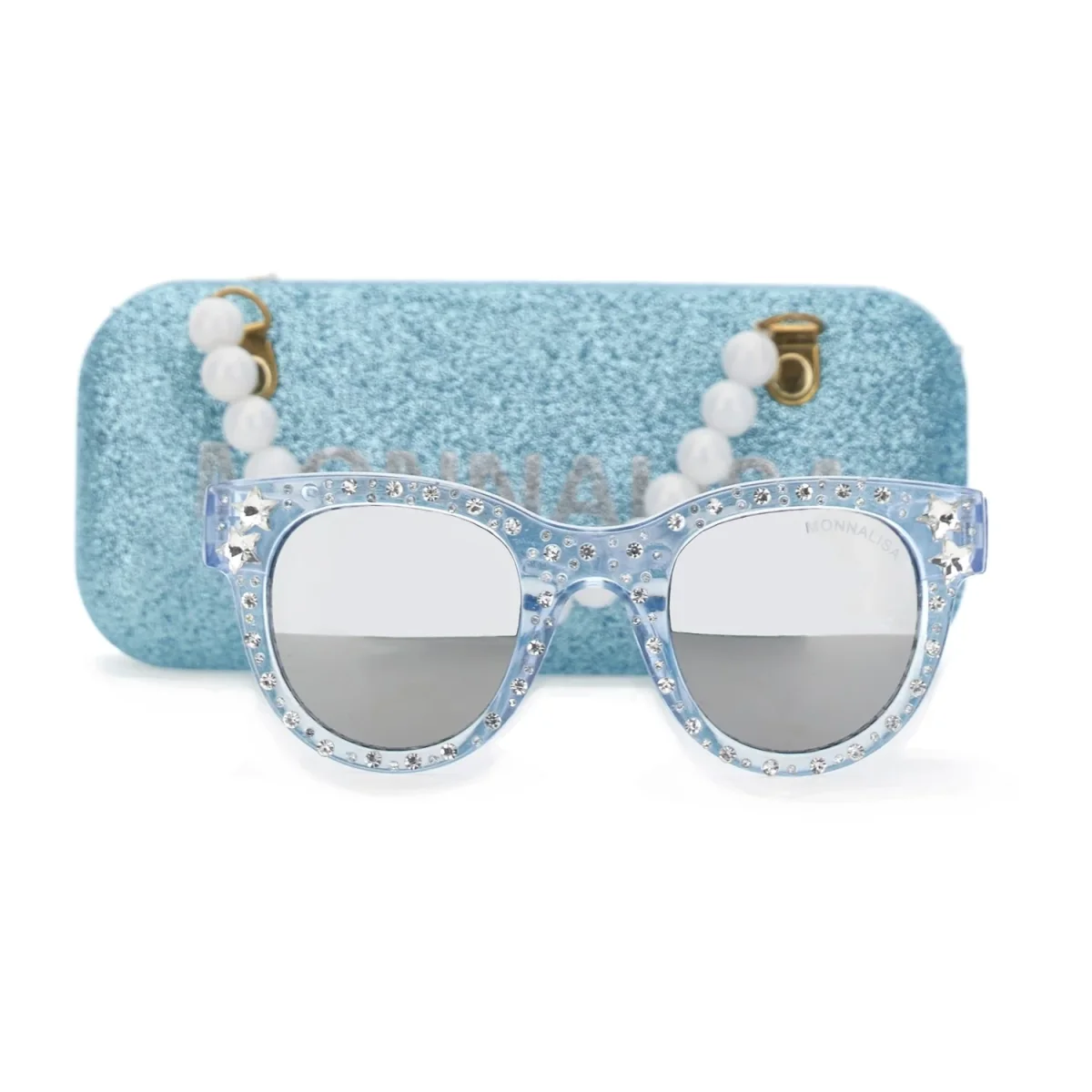 Occhiali MONNALISA con strass applicati vetro specchiato fodera portaocchiali in glitter con manico in perline UV 400 PROTECTION.