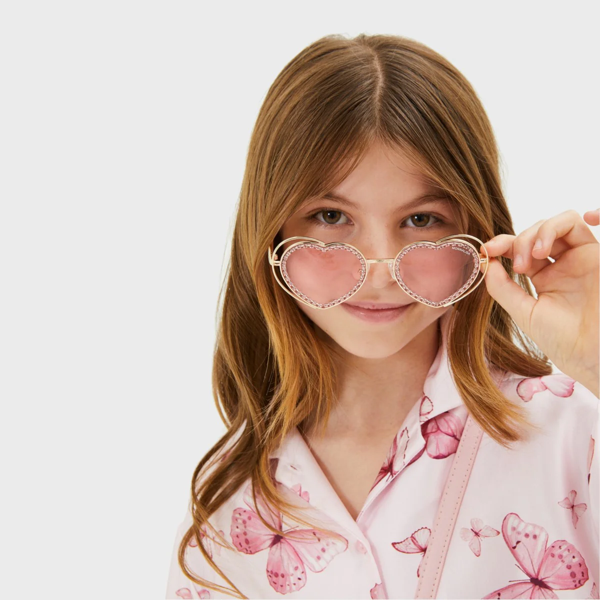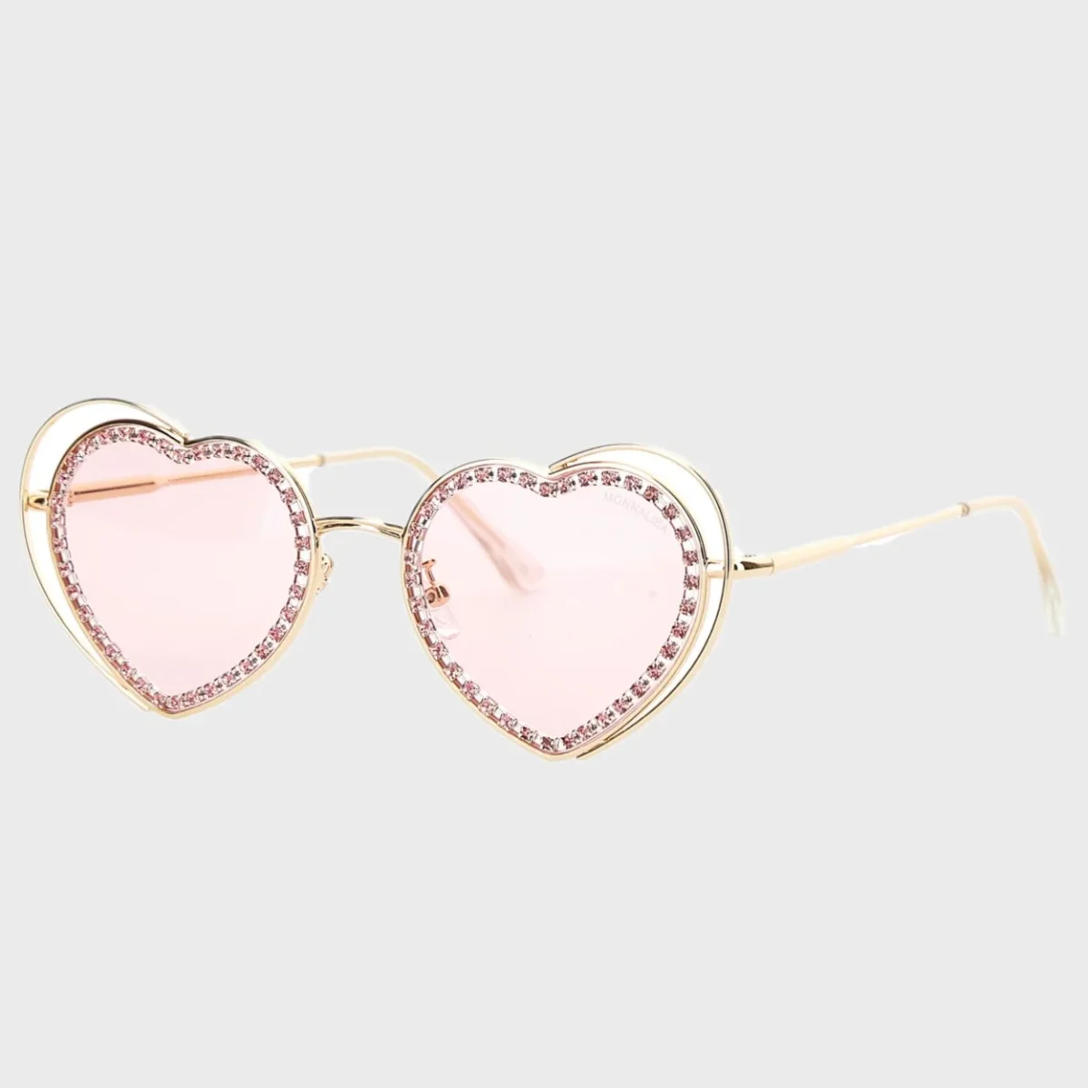 Occhiali MONNALISA con strass applicati, logo stampato applicato sulla lente, fodera porta occhiali con moschettone e ciondolo cuore logato applicato. UV 400 PROTECTION.