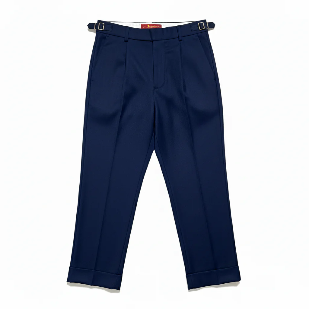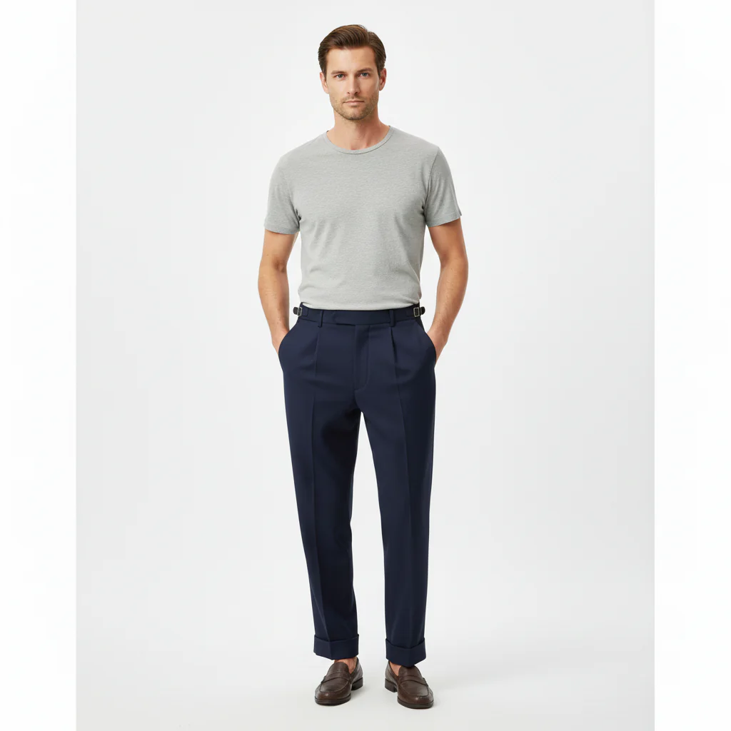 Pantalone uomo loose fit in tessuto tecnico. Vita alta con cinturino laterale chiuso da doppio bottone, fibbie laterali, gancio interno, doppia pences in vita. Tasche a filo laterali, taschini posteriori. Gamba larga e fondo che tende a stringere con piega con risvolto. Composizione tessuto 76% poliestere 20% rayon 6% elastan.