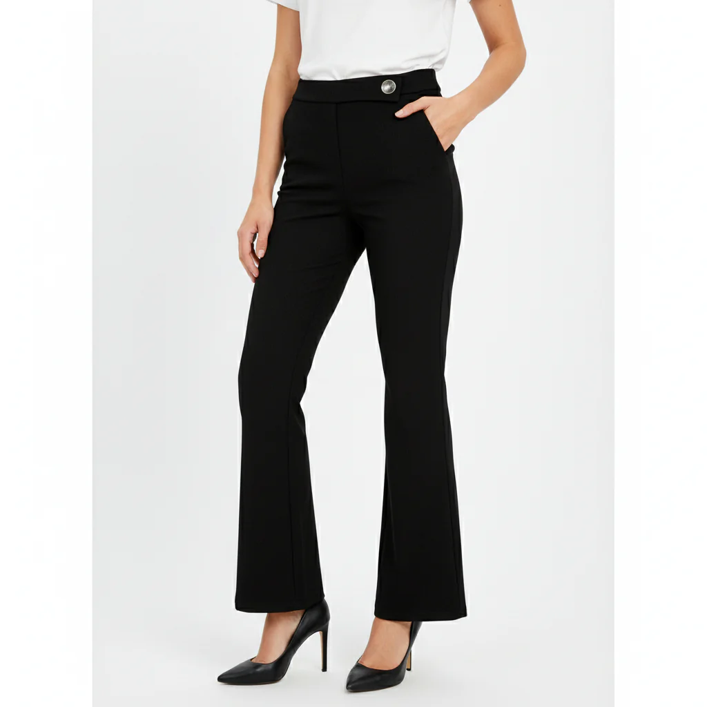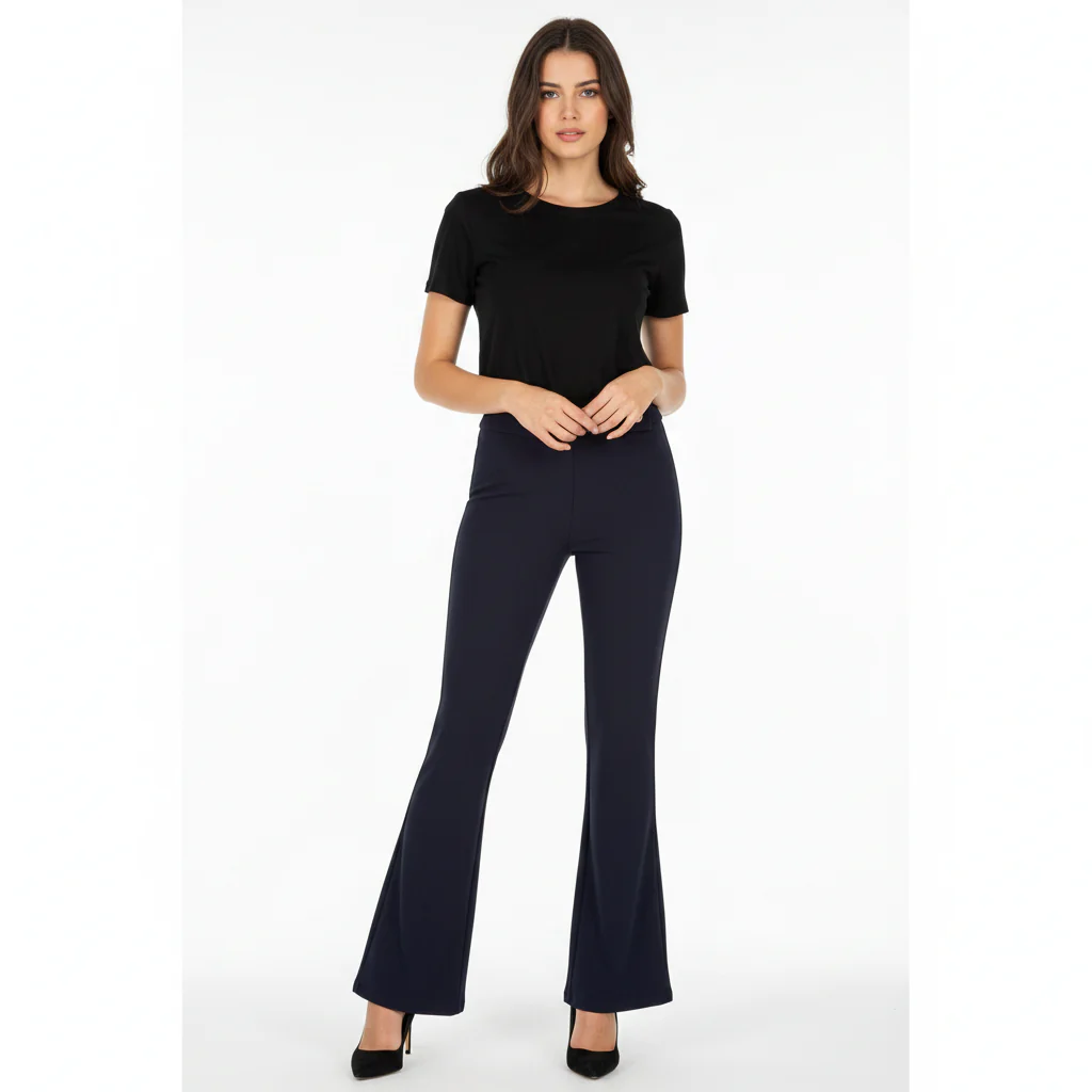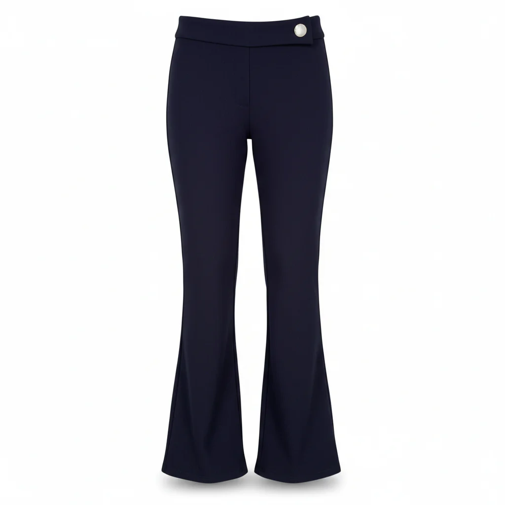 Pantalone in tessuto elasticizzato maglina punto milano. Vita alta, fascia con finto bottone applicato, chiusura laterale con zip invisibile. Gamba aderente fino al ginocchio e fondo a zampa. Questo articolo veste piccolo, consigliamo di acquistare una taglia in più. Crea il tailleur con la giacca abbinata. Composizione tessuto 65% viscosa 30% poliammide 5% elastan.