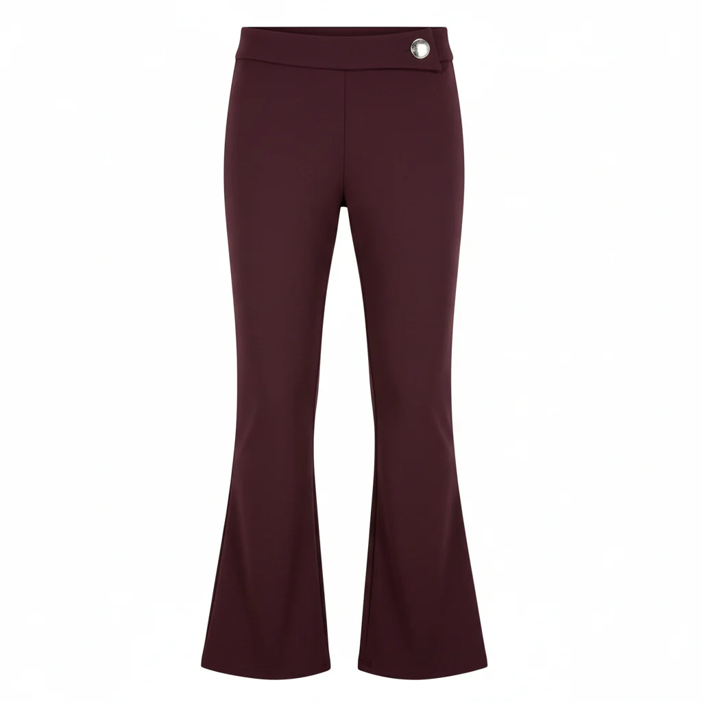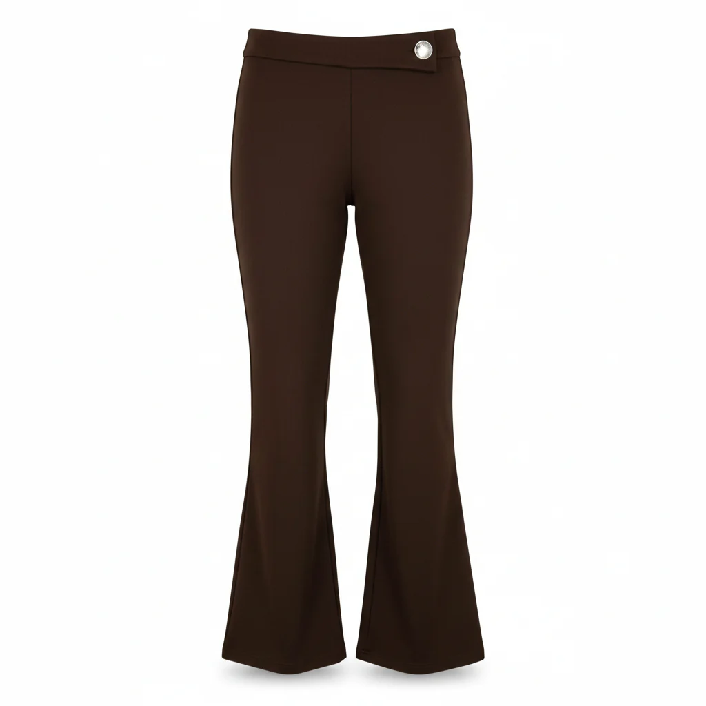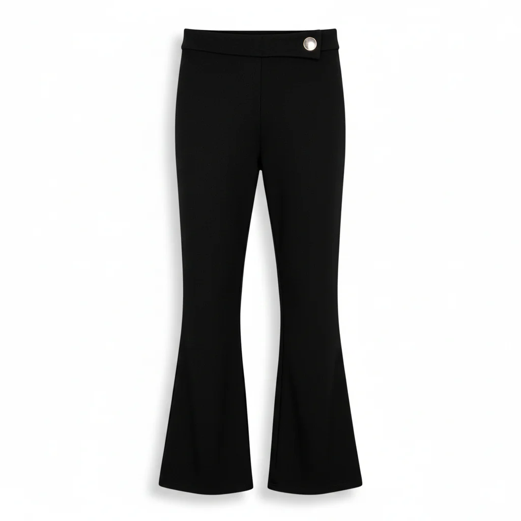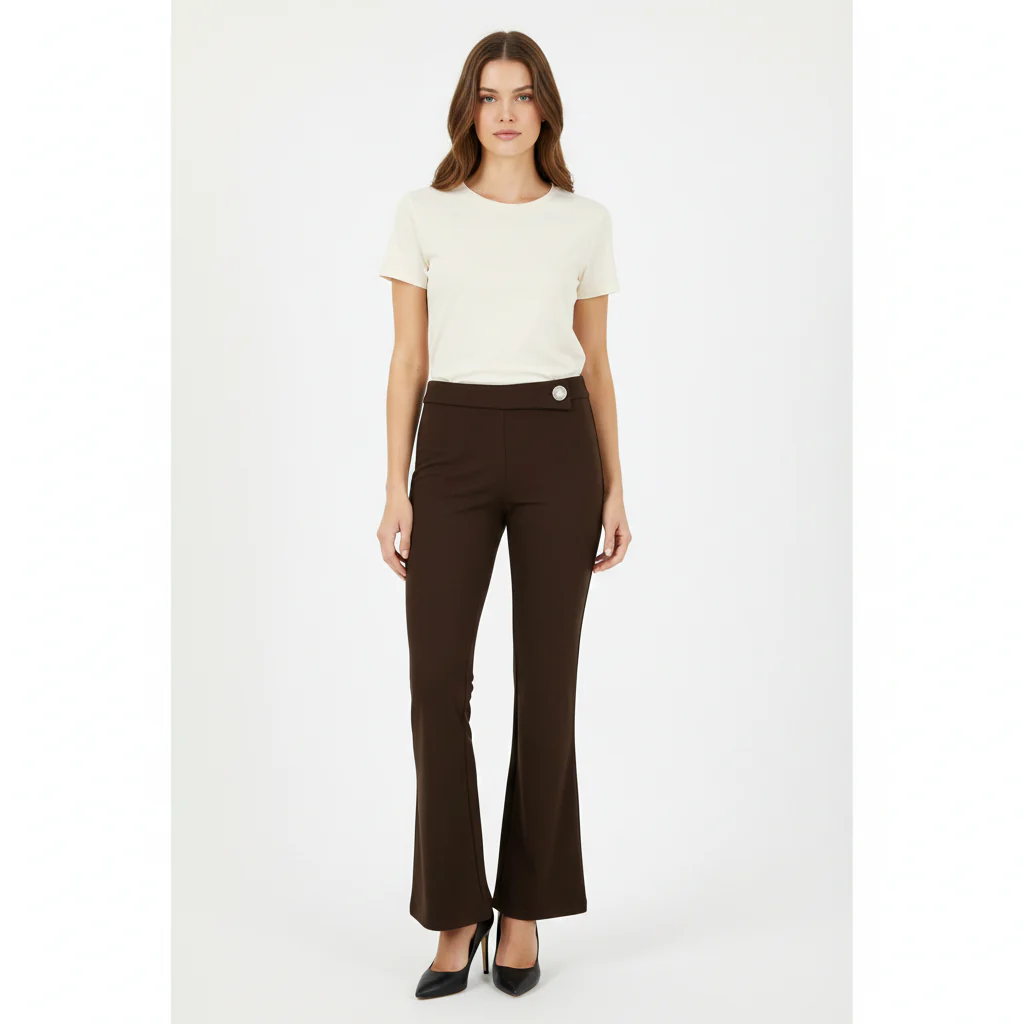 Pantalone in tessuto elasticizzato maglina punto milano. Vita alta, fascia con finto bottone applicato, chiusura laterale con zip invisibile. Gamba aderente fino al ginocchio e fondo a zampa. Questo articolo veste piccolo, consigliamo di acquistare una taglia in più. Crea il tailleur con la giacca abbinata. Composizione tessuto 65% viscosa 30% poliammide 5% elastan.