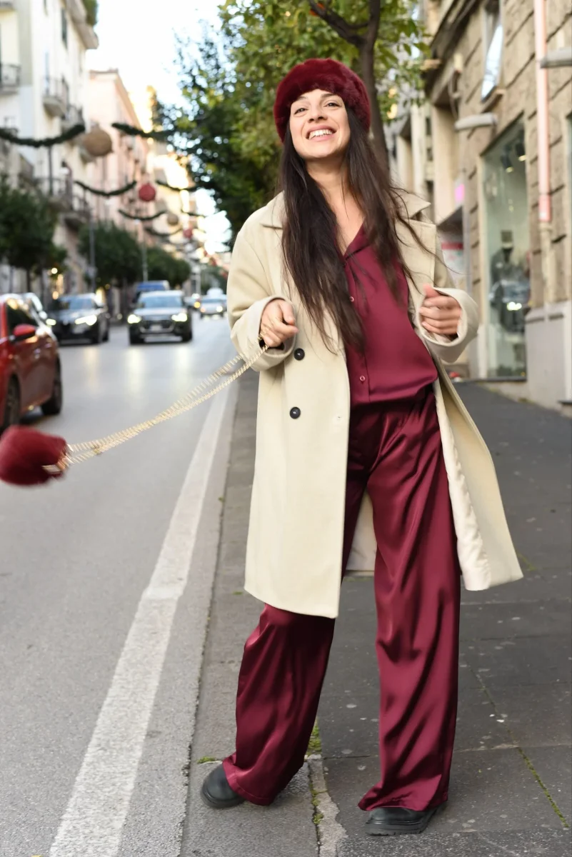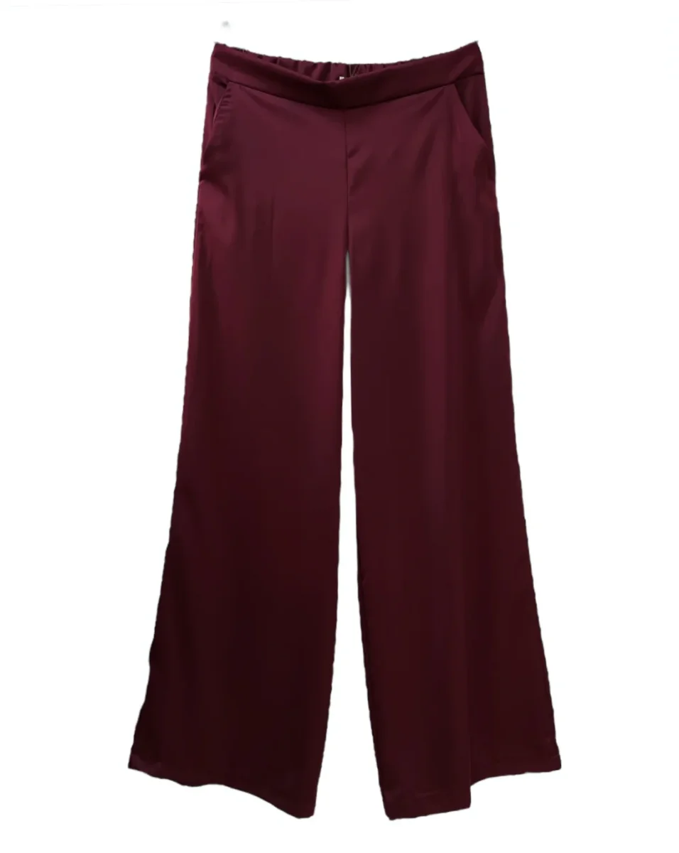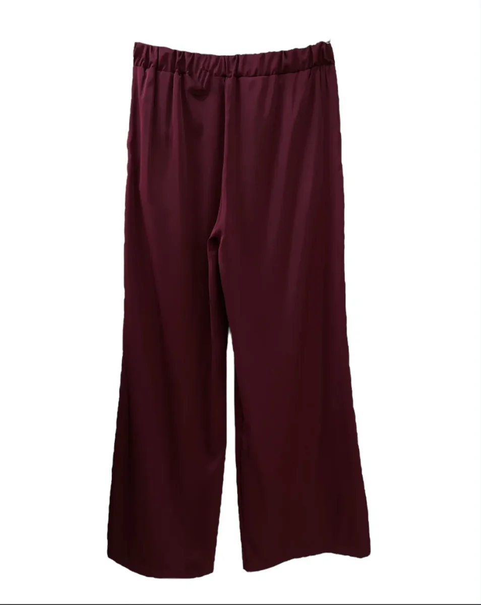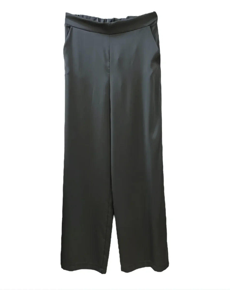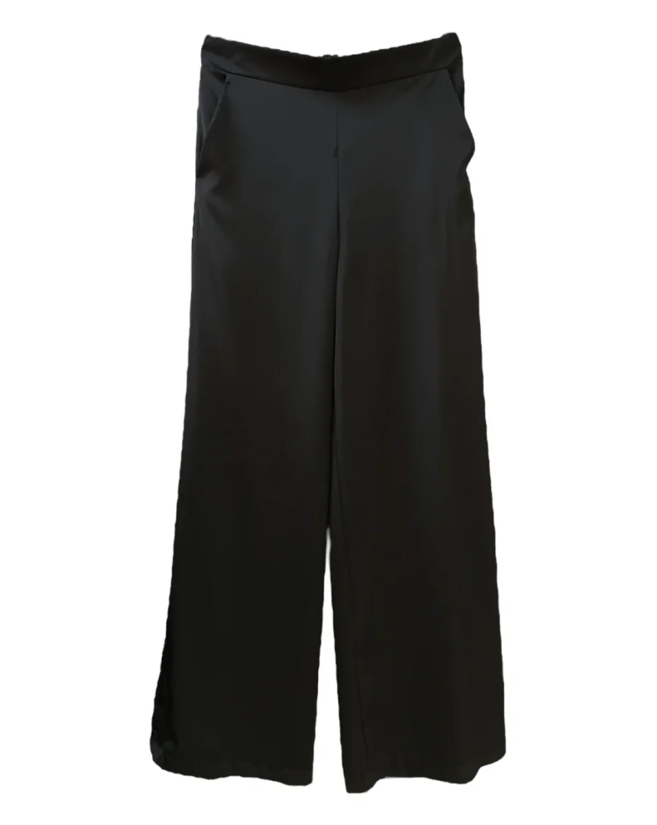 Pantalone palazzo in tessuto raso lucido. Vita regolare con cinturino fisso sul davanti ed elastico sulla schiena. Gamba e fondo molto ampi. Crea il completo con la casacca o la camicia abbinate. Tessuto 100% poliestere. Taglia in foto S.