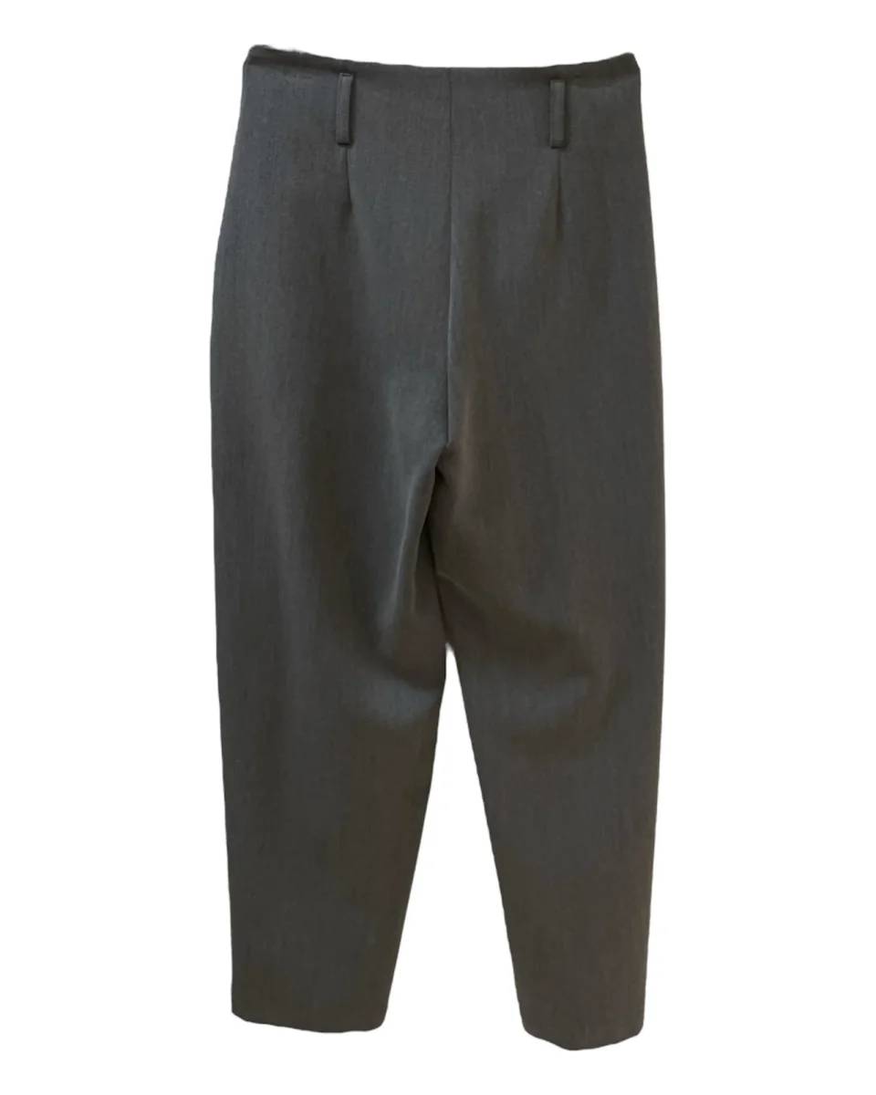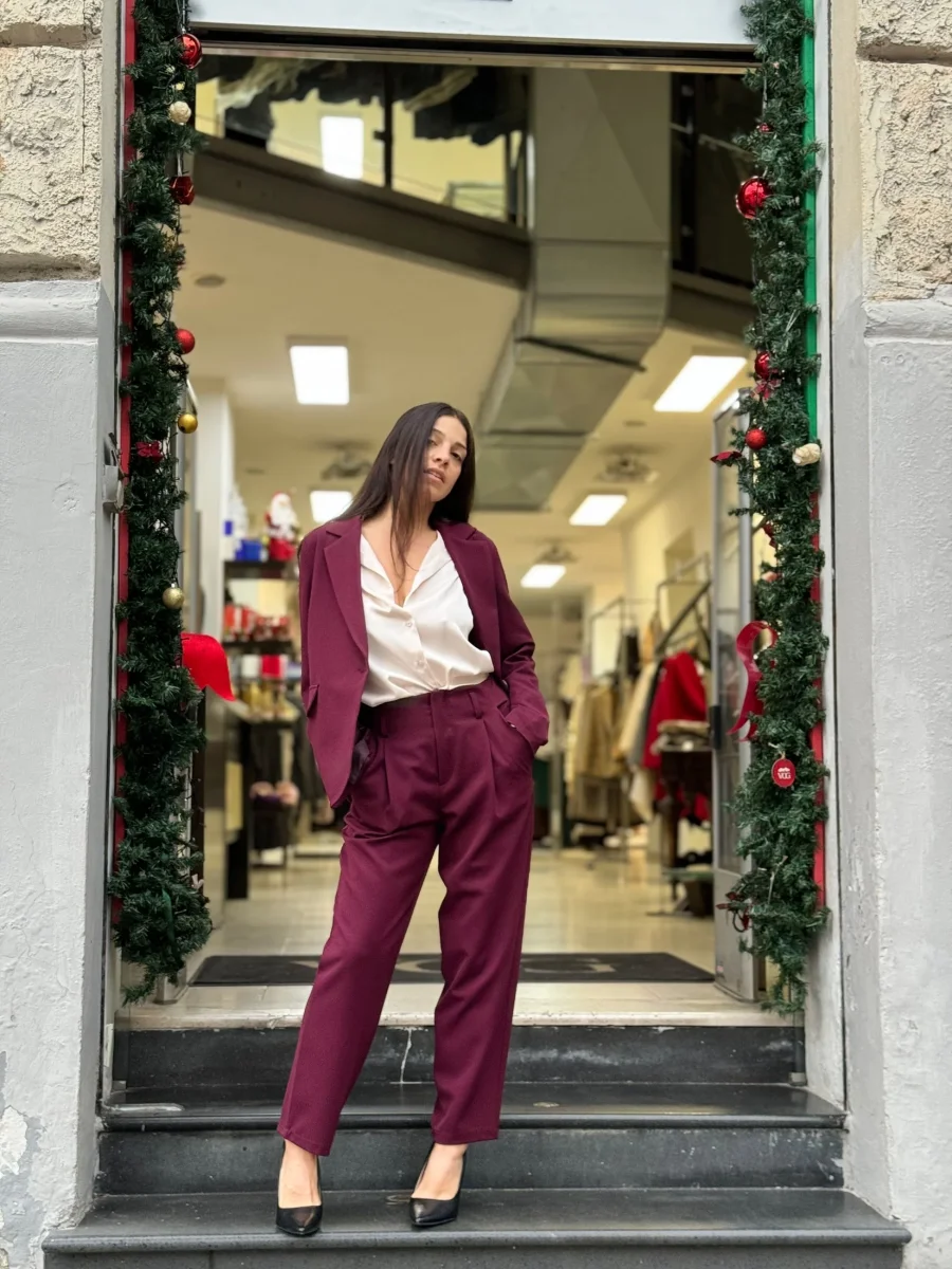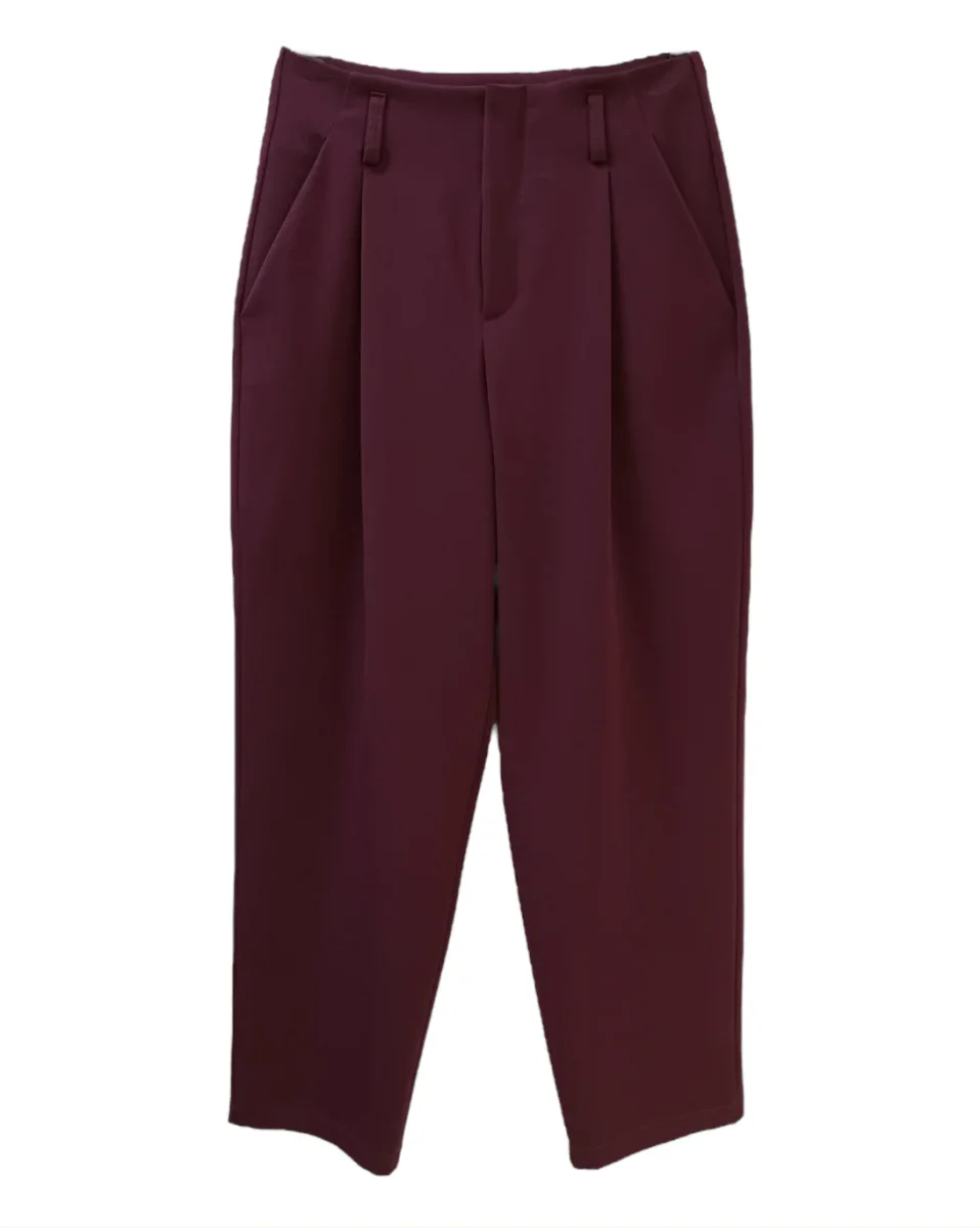 Pantalone basic in tessuto tecnico poliviscosa. Vita alta con pences e passanti, chiusura con zip, bottone interno e gancio invisibile. Tasche a filo. Gamba ampia e fondo dritto, vestibilità baggy. Crea il tailleur con la giacca abbinata. Tessuto 73% poliestere 22% viscosa 5% elastan.