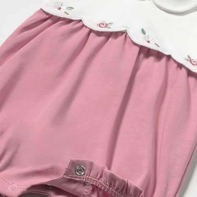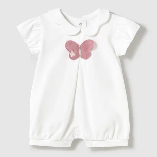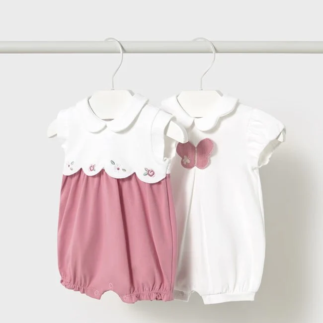 Pagliaccetti MAYORAL in cotone , uno total white con farfalla applicata , l altro con farfalle ricamate . Entrambe con chiusura con clips sul retro.