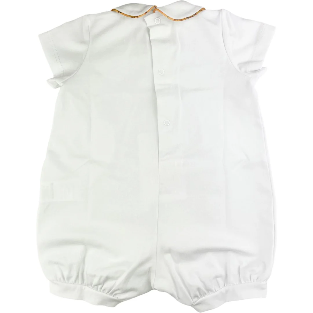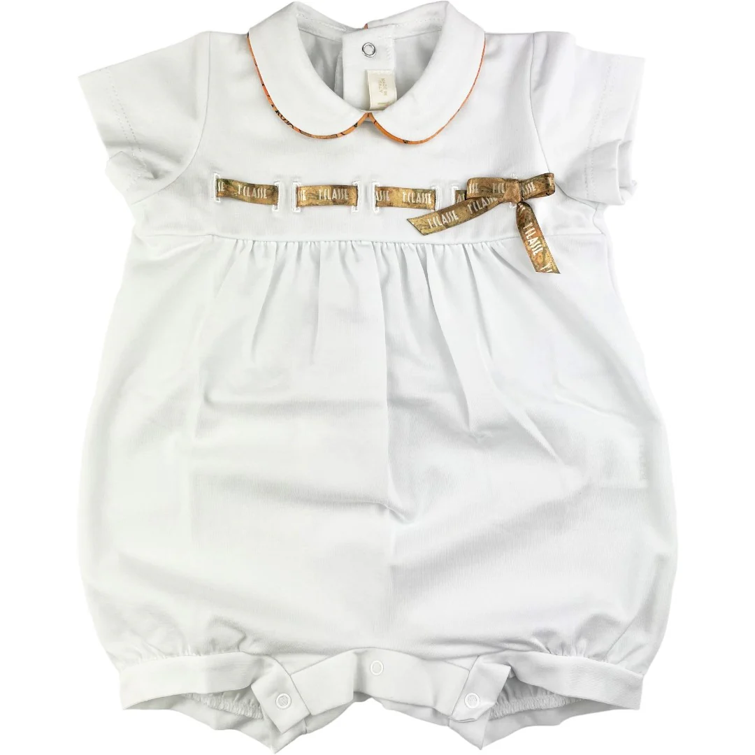 Pagliaccetto ALVIERO MARTINI 1&degCLASSE in cotone con rifiniture e fiocco a contrasto con fantasia istituzionale alviero martini. apertura con clips.MADE IN ITALY
