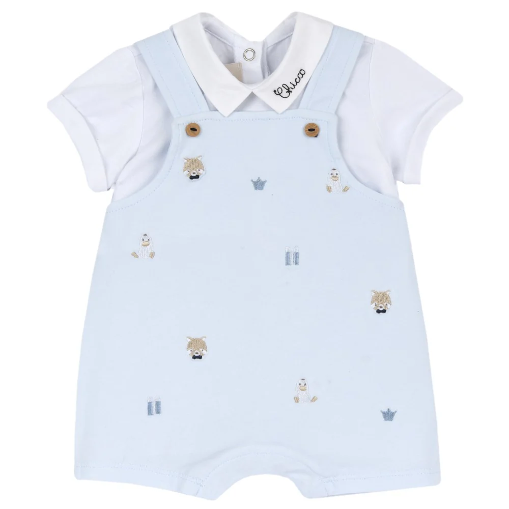 Pagliaccetto CHICCO in cotone modello finta salopette con ricami in colori a contrasto applicati logo ricamato sul colletto chiusura con clips.